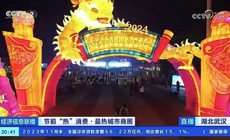 “我现在在武汉东湖龙年灯会的现场,随着2024年新年的临近,这里已经被装点得流光溢彩、灯火璀璨,新年的气息扑面而来……”当日20时40分,武汉东湖龙年灯会亮相央视新闻,以5分钟的时长向全国观众呈现出东湖畔火树银花不夜天的热闹景象。