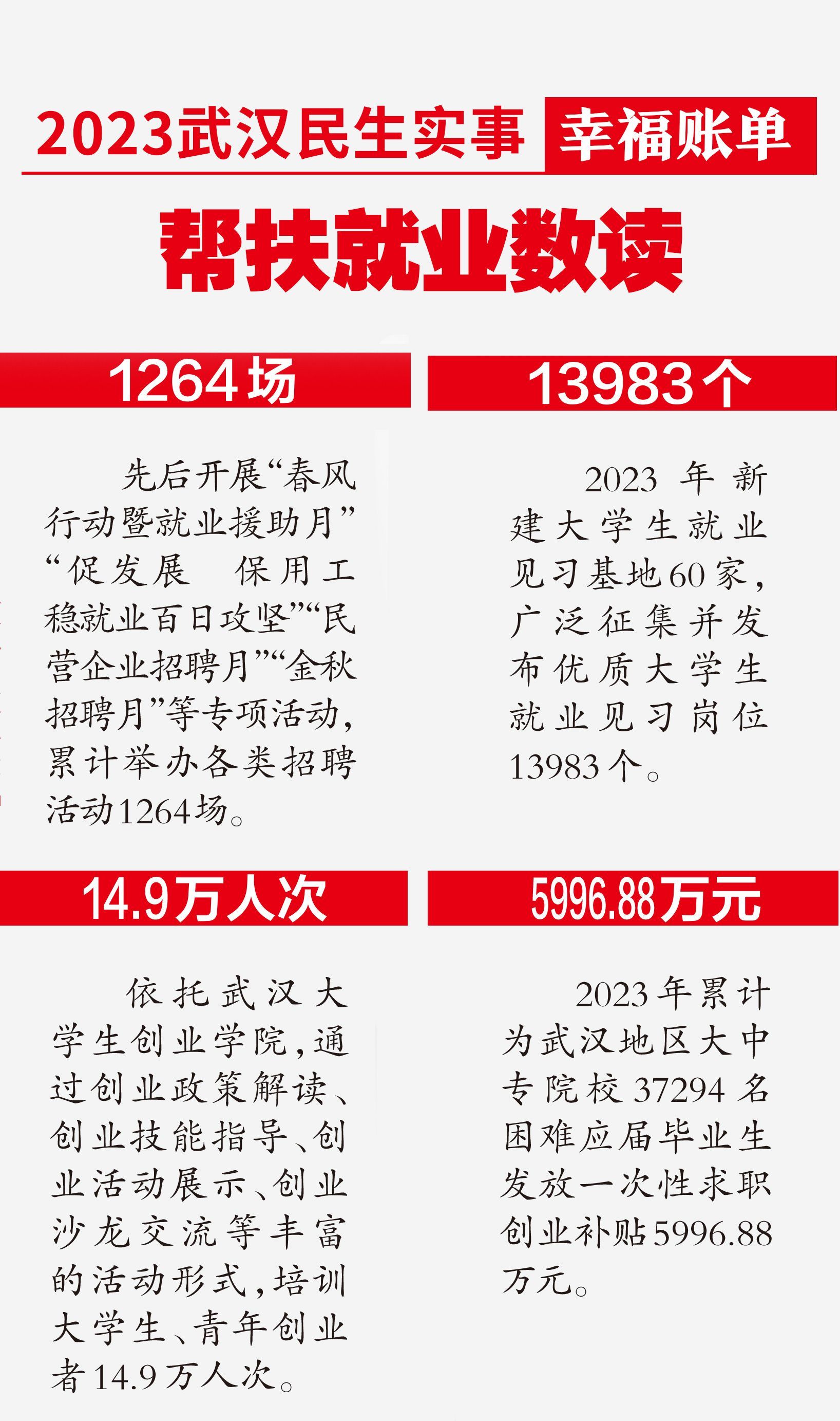 就业是最基本的民生,高校毕业生就业是稳就业的重中之重。按照市委、市政府做好高校毕业生就业创业工作有关部署要求,武汉市人社局不断加强就业见习基地建设,对见习单位按规定给予补贴,对见习期满留用率超过50%的单位,按留用人数给予奖补。去年以来,定向邀约我市“965”产业重点企业、专精特新企业参与大学生就业见习基地建设,新建见习基地60家,累计设立见习基地607家,征集筛选优质见习岗位13983个,发放见习补贴1128万元,不断拓宽大学生就业渠道,增强大学生就业能力。