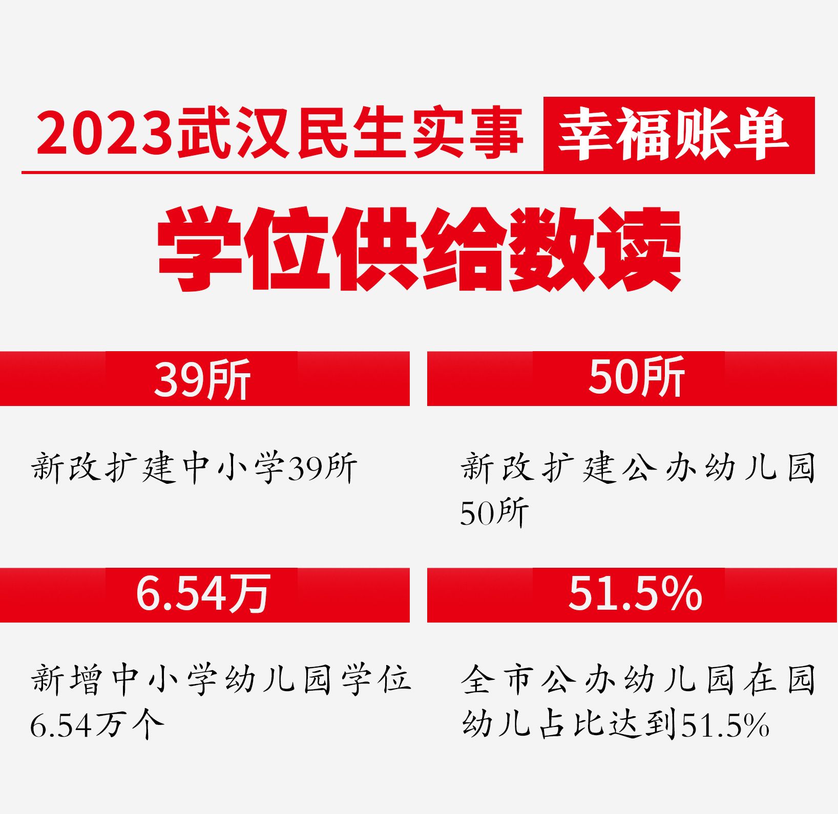 武汉市教育局相关负责人表示,2023年武汉市政府加大学位供给保障,89所新改扩建的中小学、公办幼儿园竣工投入使用,新增学位6.54万个,超额完成《政府工作报告》确定的年度任务。全市公办园在园幼儿占比达到51.5%。市教育局在加大教育投入的同时,积极推动优质教育资源均衡布局,引育并举拓展优质教育资源总量,确保适龄儿童、少年“有学上”“上好学”,让新改扩建的中小学实现“新建即优质”。