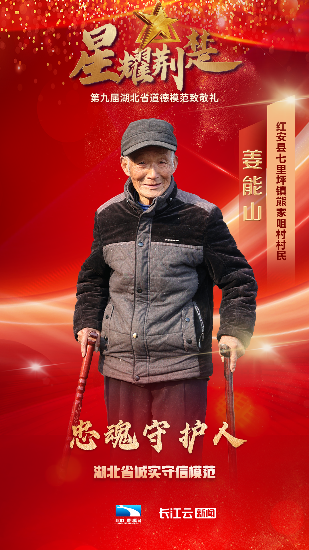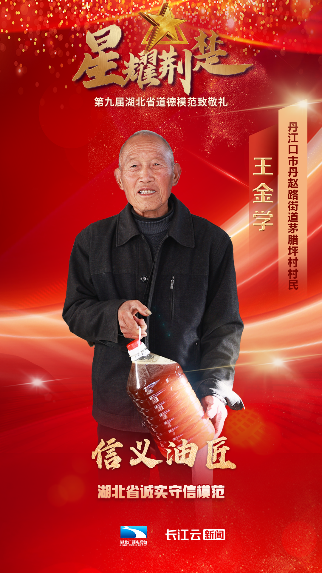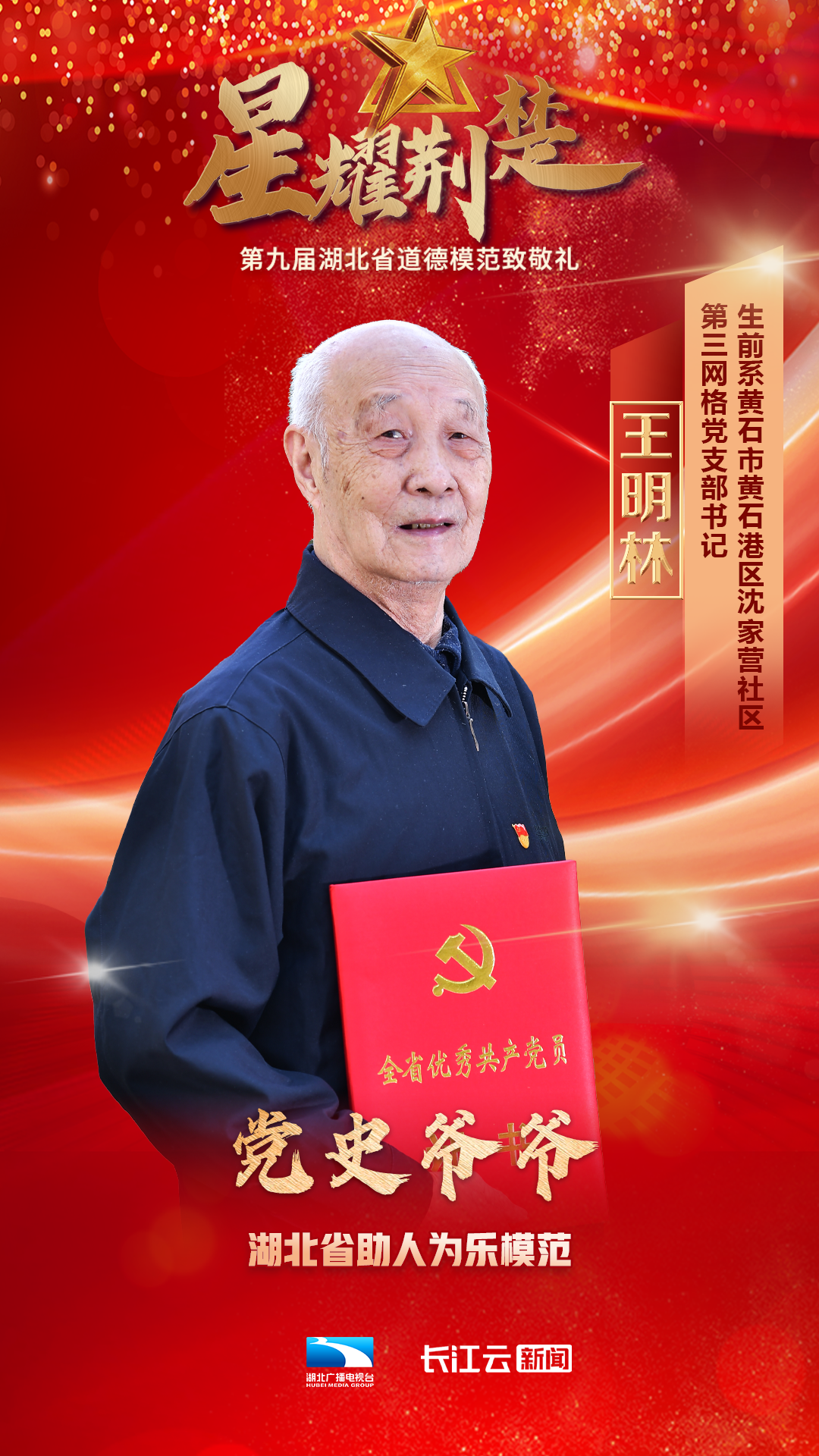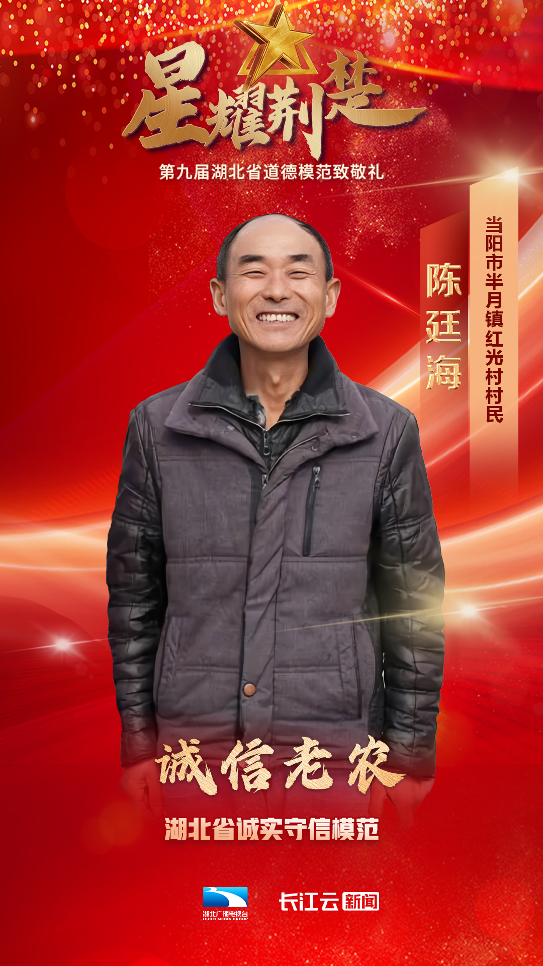1月10号,由省委宣传部、省文明办、省总工会、团省委、省妇联、省人社厅主办、湖北广播电视台新闻中心承办的星耀荆楚——第九届湖北省道德模范致敬礼在武汉举行,会上公布了第九届湖北省道德模范名单,授予邓兰舟等17名同志、追授王明林等3名同志“湖北省道德模范”称号。