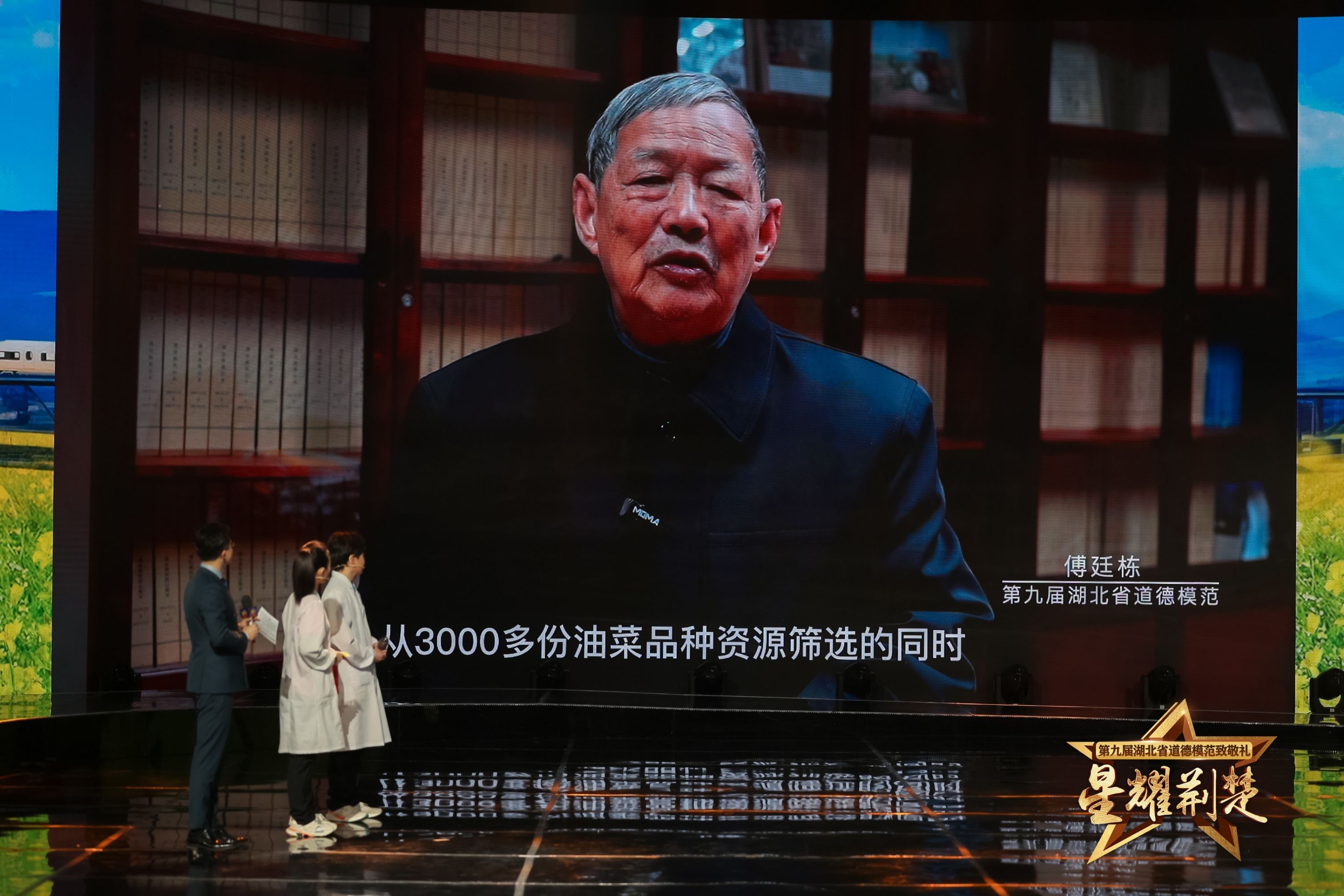 长江日报大武汉客户端1月10日讯(记者周劼)“他要尽快赶到新疆,查看新一茬耐盐碱油菜的生长情况。”1月10日,“星耀荆楚——第九届湖北省道德模范致敬礼”在武汉举行,华中农业大学傅廷栋院士获评2023年“敬业奉献”道德模范,86岁的他不得不缺席颁奖仪式,他委托学生送来一个瓶子。