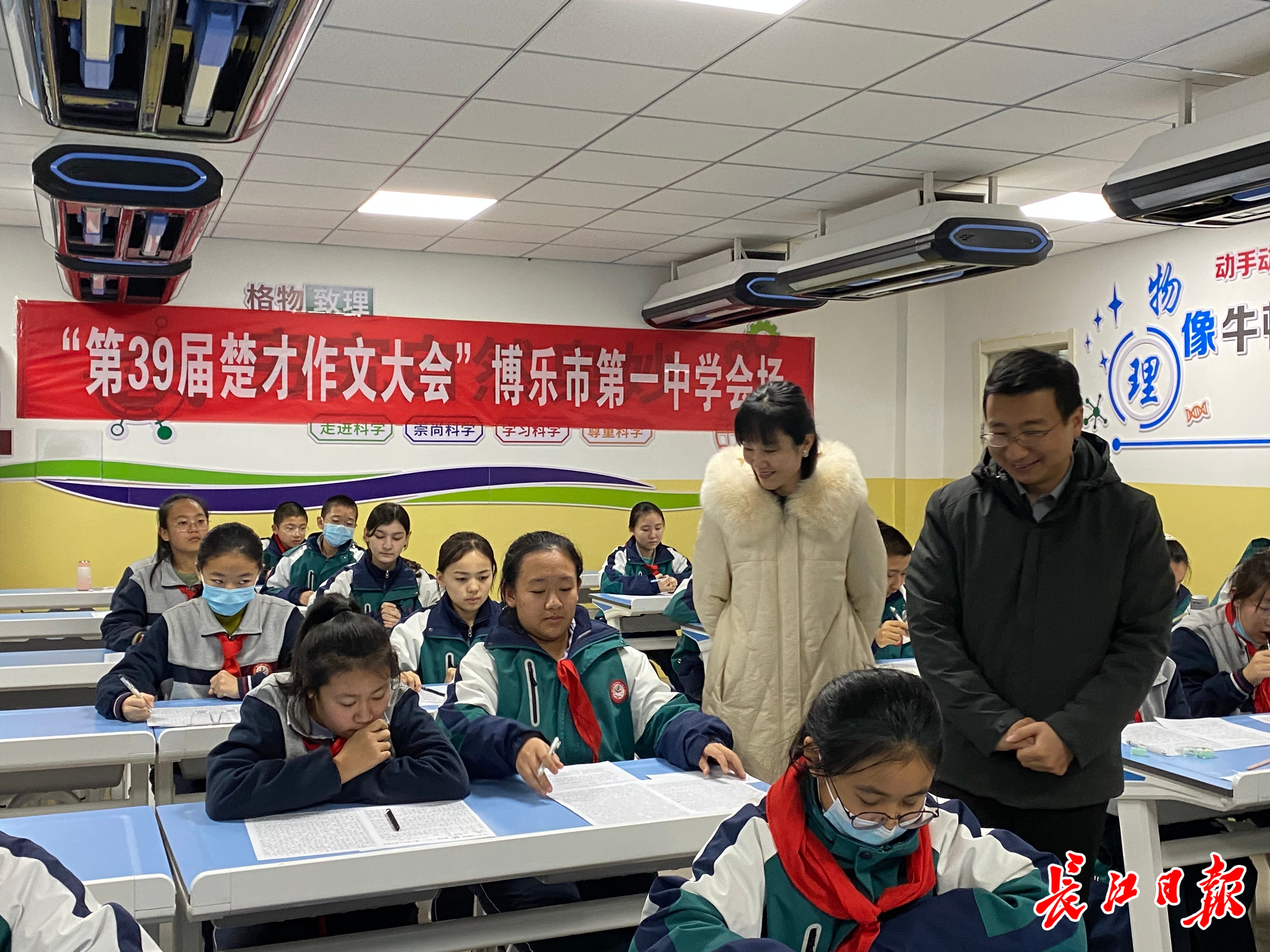 “楚才”作文是经武汉市人民政府批准认可,由韬奋基金会、长江日报社、楚才竞赛委员会联合主办的大型公益性青少年写作交流活动。自1985年创办以来,已连续举办38届,已成为湖北的文化品牌、武汉的城市名片。2023年是第39届楚才作文写作大会,经过武汉援疆工作队协调组织,12月11日17时,第39届楚才作文写作大会博乐分会如期举行,共有来自23所中小学28个民族的4433名学生,在122个考场参加楚才写作。