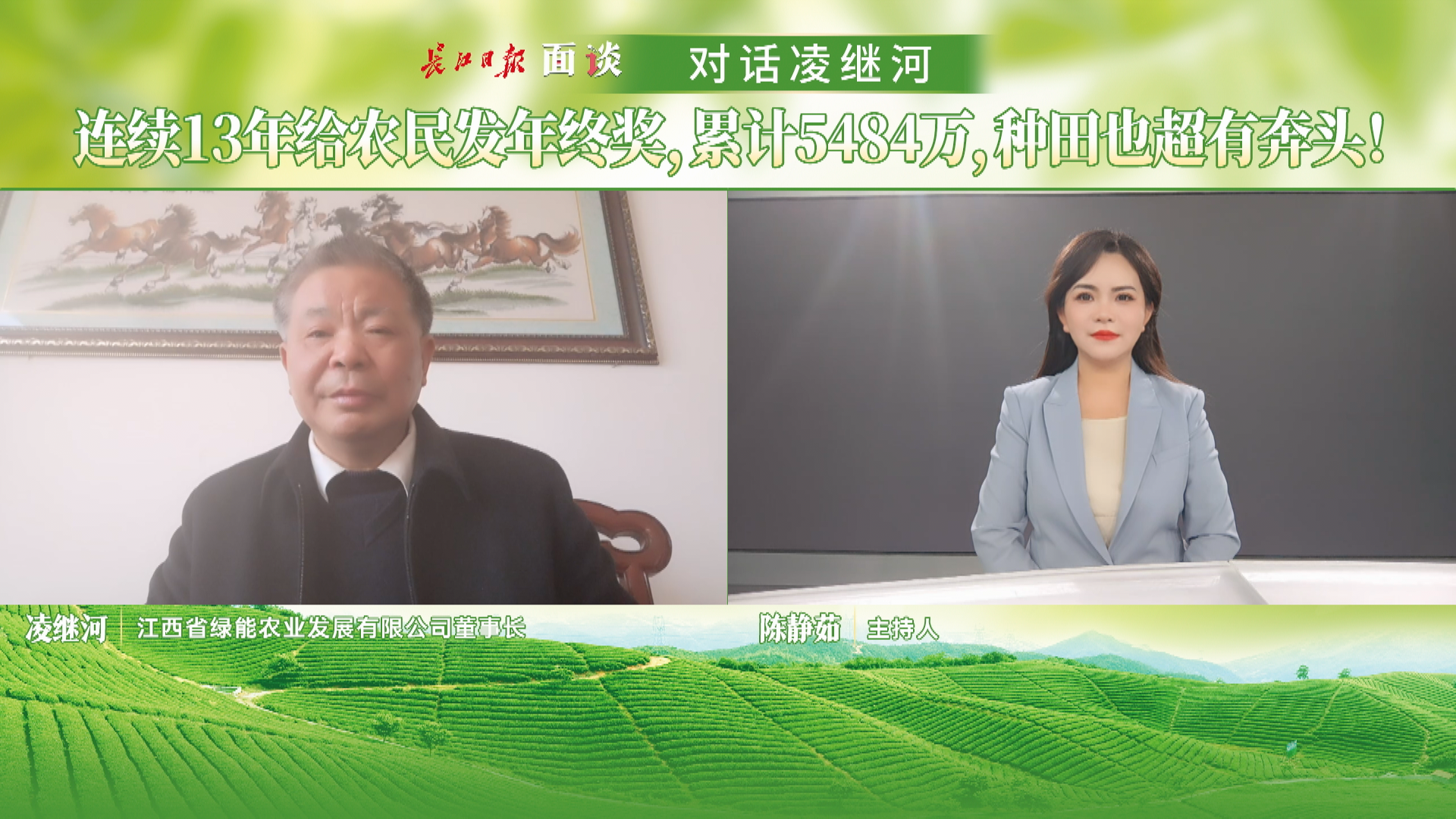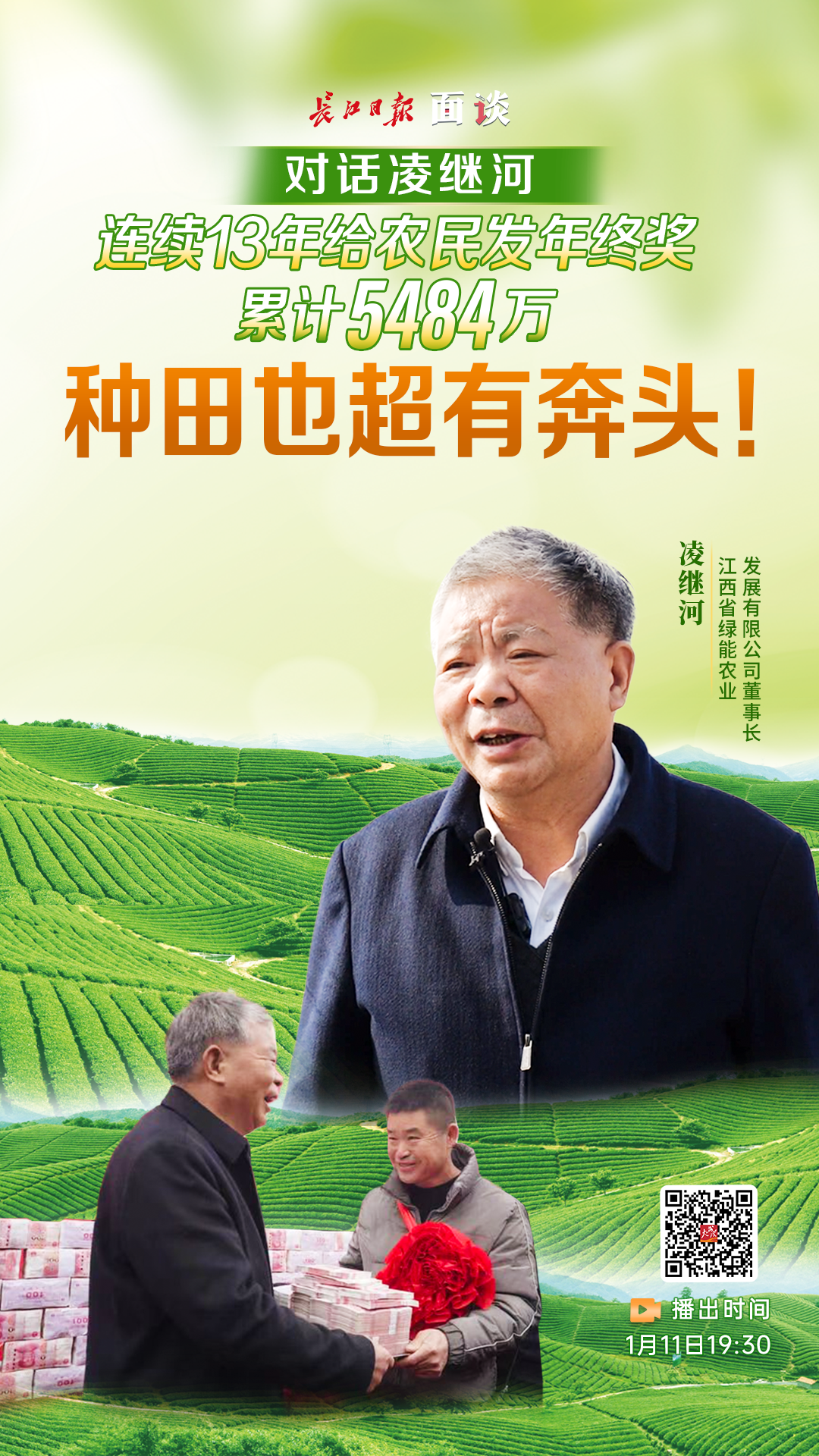 近日,在南昌安义县鼎湖镇,1169万元现金堆在长桌上,这是当地种粮大户、江西省绿能农业发展有限公司董事长凌继河当场要给农民兄弟发放的年终奖。返乡种田十多年来,他连续13年给为他管理农田的农民发年终奖,累计超过5000万元。1月11日,凌继河做客《面谈》,讲述他带领当地农民增收的故事。