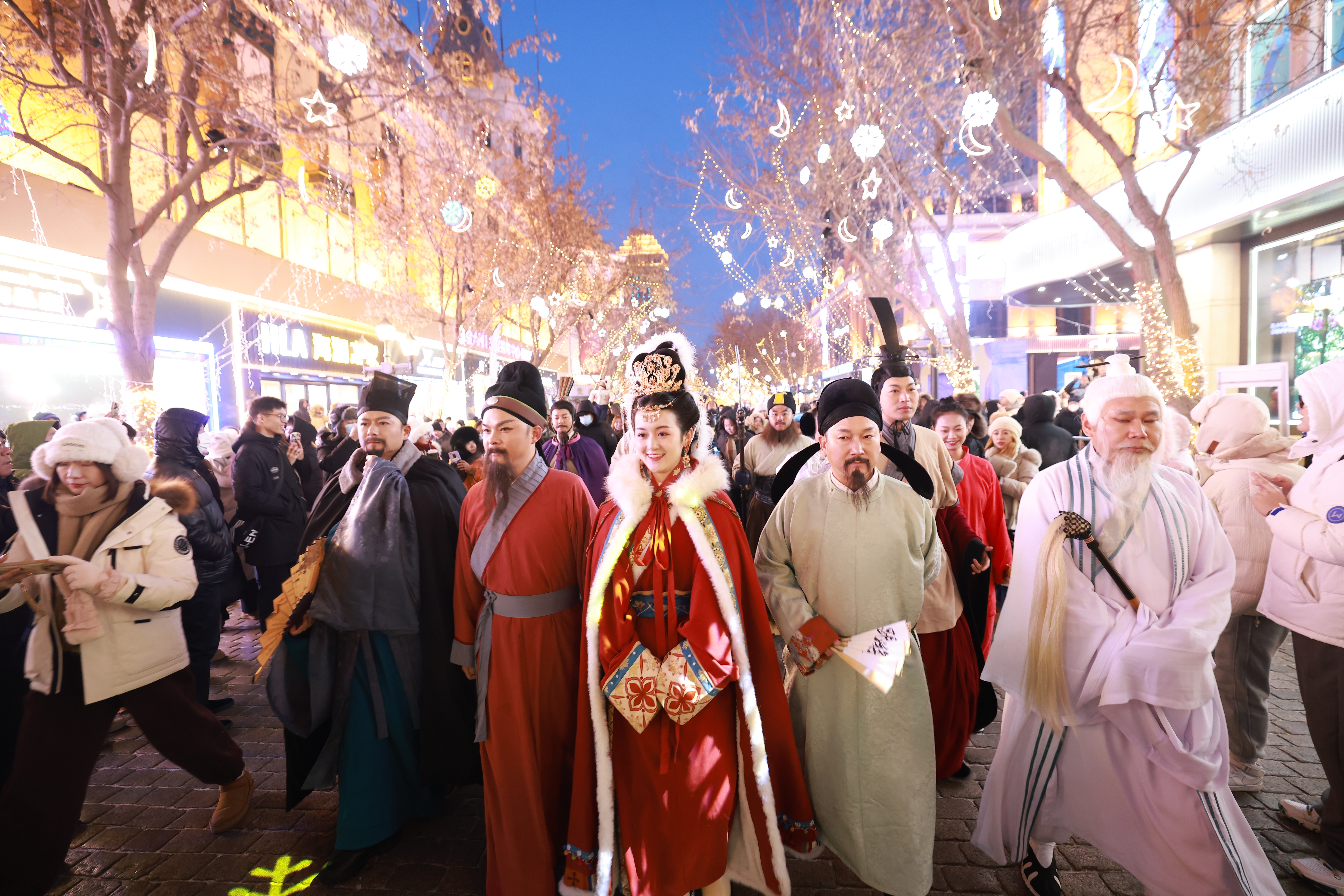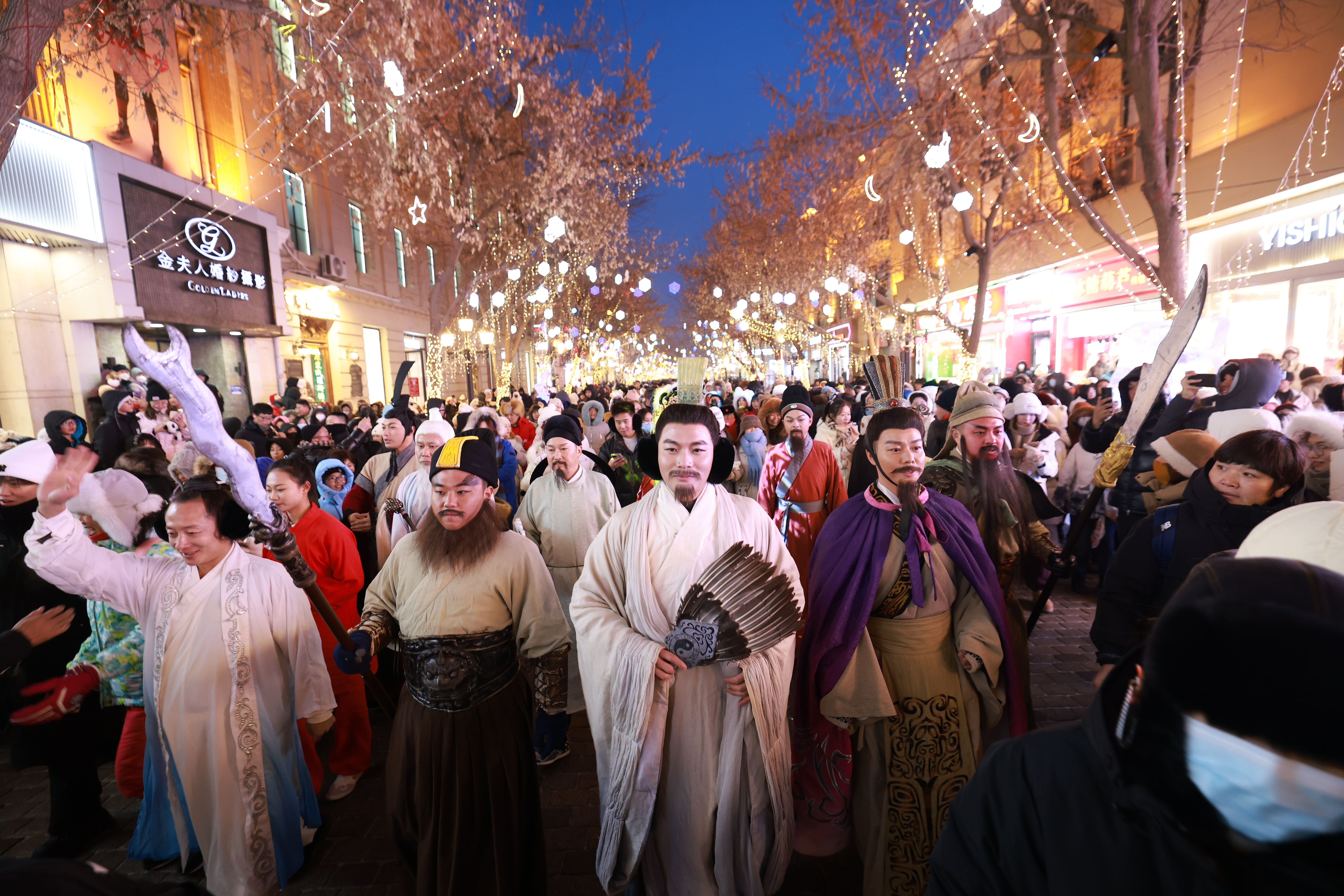 “这是张飞,那是刘备,还有关羽的脸真的涂红了!”跟着家长前来游玩的孩子们最好奇,摸摸“关羽”的大刀,又分辨谁是“屈原”,谁是“苏东坡”。一名看过《长安三万里》的小学生对妈妈说:“李白写了很多关于黄鹤楼的诗,黄鹤楼就在湖北武汉。”“哇,‘王昭君’小姐姐好漂亮!”大街上,来自宜昌的“王昭君”一袭红衣分外惹眼,迅速成为新晋网红,过往游客纷纷举起相机为她拍视频,和她合影。有游客看见“王昭君”穿着演出服,心疼地问她:“你冷不冷?多贴点暖宝宝,别冻着了。”“但愿人长久,千里共婵娟。”当“苏东坡”踏上冰雕黄鹤楼的舞台上开始吟诗,孩子们也纷纷站上去一起合影。站在冰雕武当山前面,武当山弟子也登台来了一段太极功夫,几乎所有的游客都拿出手机来拍摄,“见识到真正的武当功夫了!”