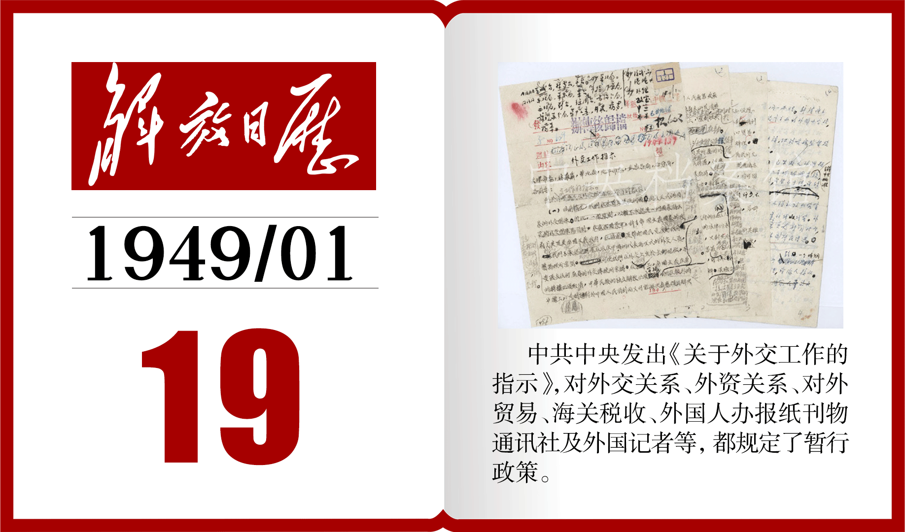 1949年的今天,中共中央发出《关于外交工作的指示》丨解放日历 ©原创 2024-01-19 12:04 0 图片来源:中华人民共和国中央人民政府网站 整理:曹欣怡 设计:陈昌 制作:张莉 【编辑:邓腊秀】