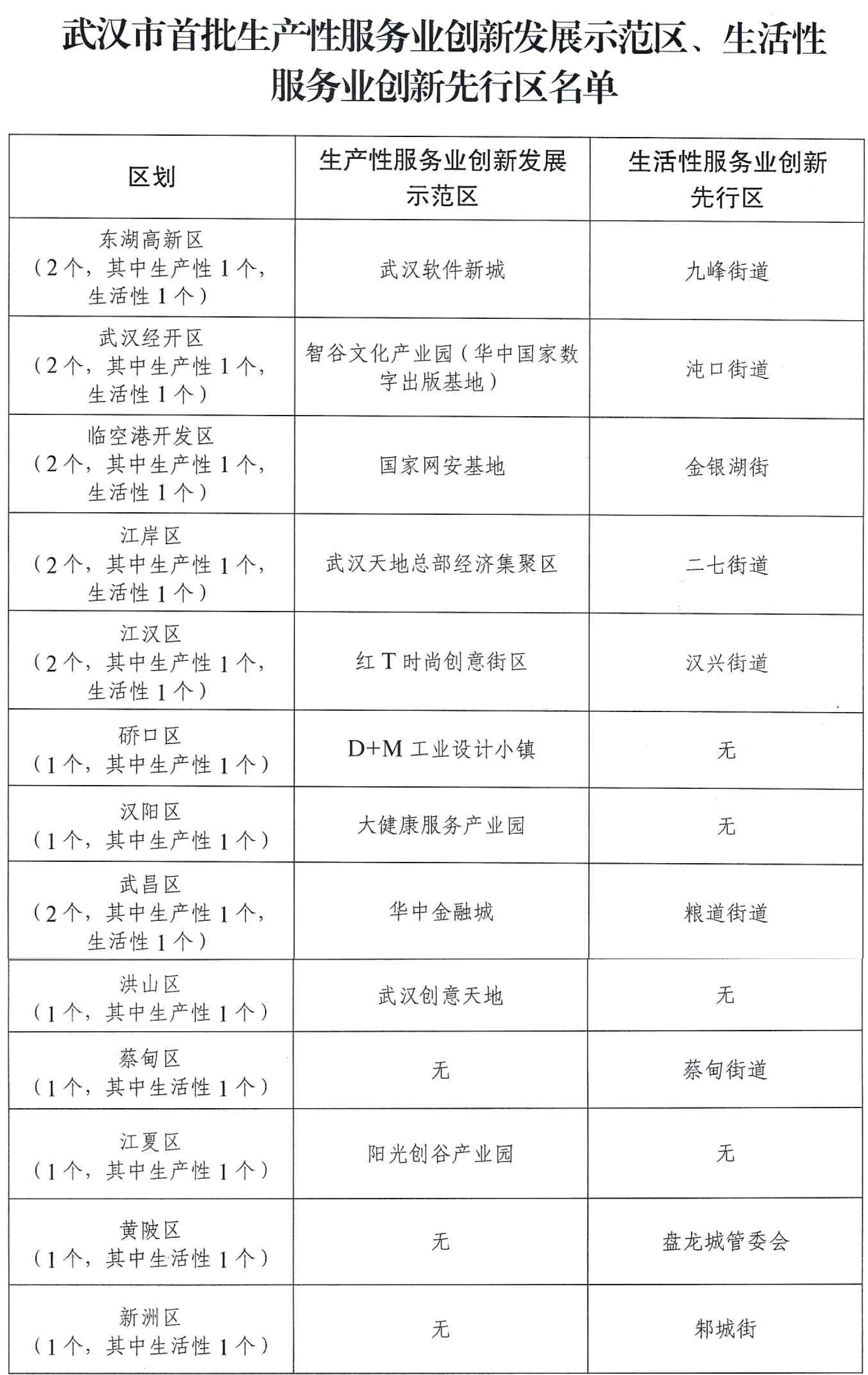 经对照相关细分指标评选,确认的10个生产性服务业创新发展示范区分别是:东湖高新区武汉软件新城、武汉经开区智谷文化产业园(华中国家数字出版基地)、临空港开发区国家网安基地、江岸区武汉天地总部经济集聚区、江汉区红T时尚创意街区、硚口区D+M工业设计小镇、汉阳区大健康服务产业园、武昌区华中金融城、洪山区武汉创意天地、江夏区阳光创谷产业园等10个园区。