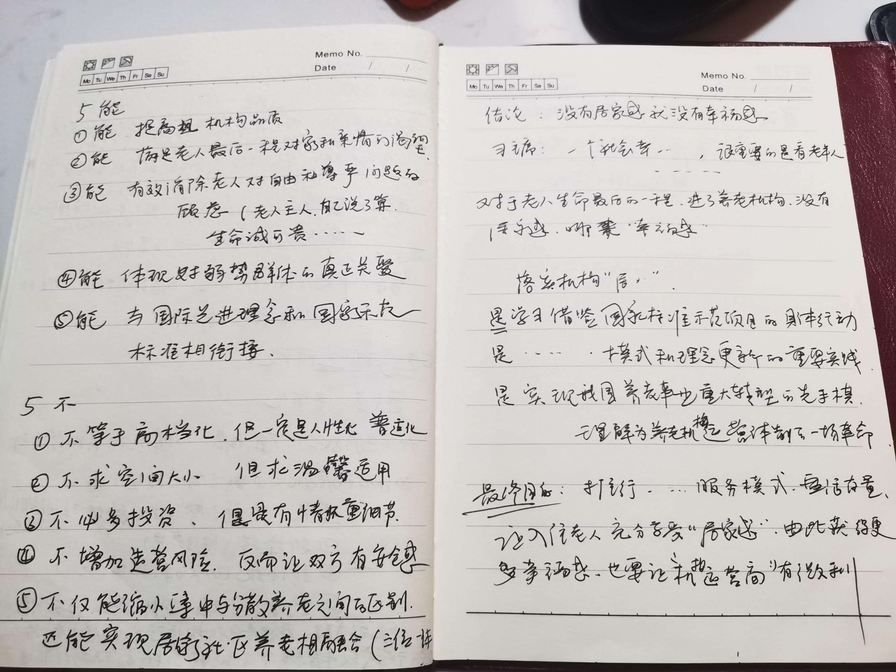 于是,围绕为何要实现机构居家化,如何实现机构居家化,她和老人一起写下了“五能”“五不”原则——