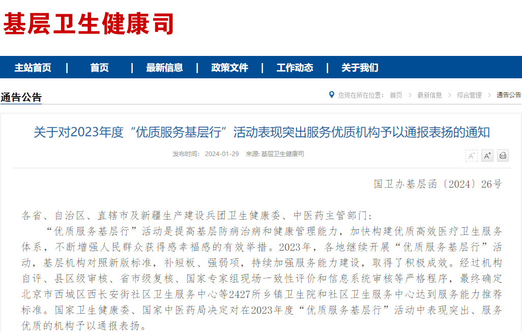 国家卫生健康委表示,希望受到表扬的机构珍惜荣誉,再接再厉,再创佳绩。各级卫生健康行政部门、中医药主管部门要提高政治站位,继续深入开展“优质服务基层行”活动,立足提供全方位全周期的基本医疗卫生服务,持续提升服务能力,不断提高服务质量,为全面推进健康中国建设和乡村振兴作出新的更大贡献。