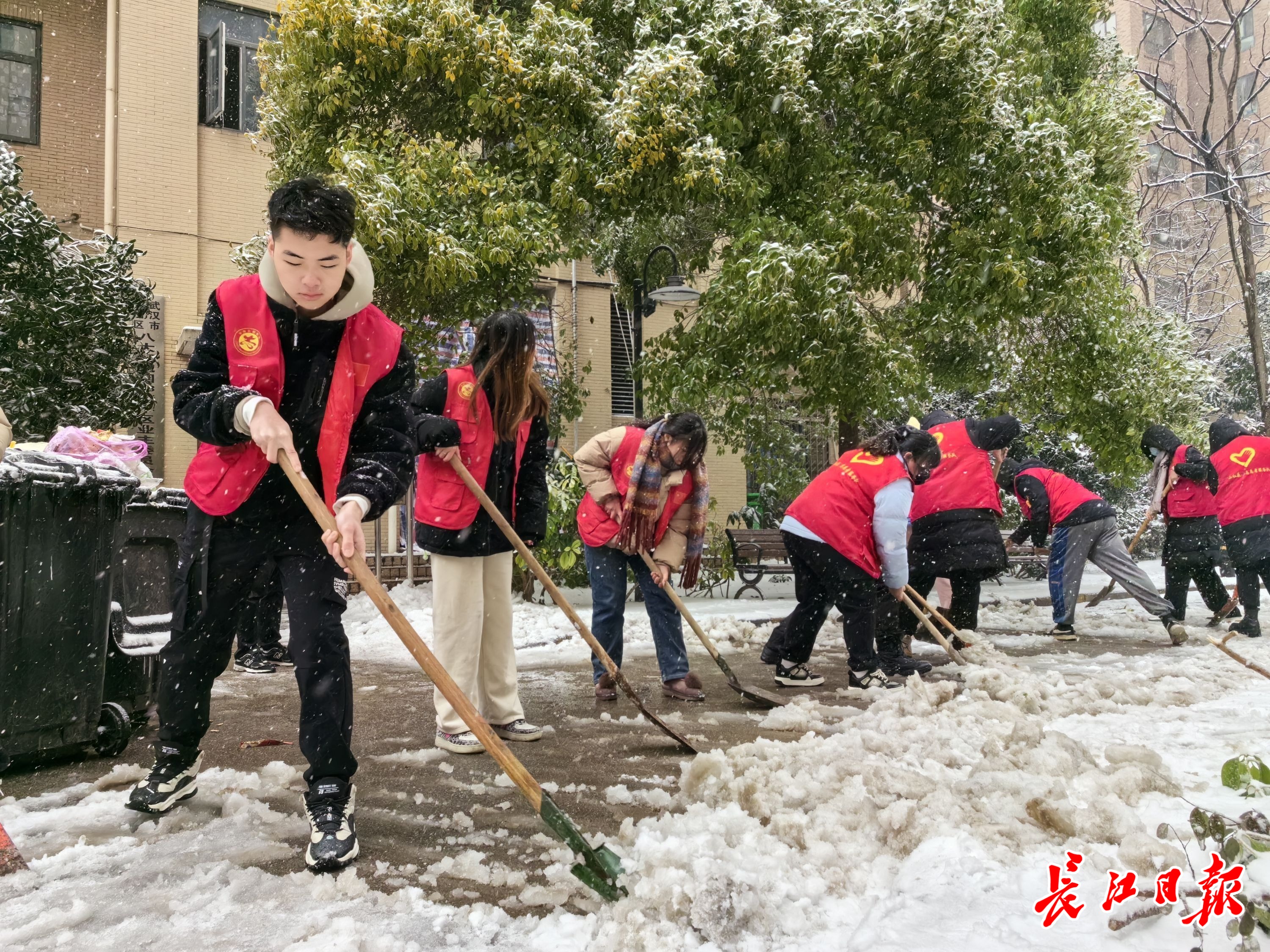 大学生在青山区红卫路街道八大家花园社区扫雪。长江日报记者覃柳玮 摄