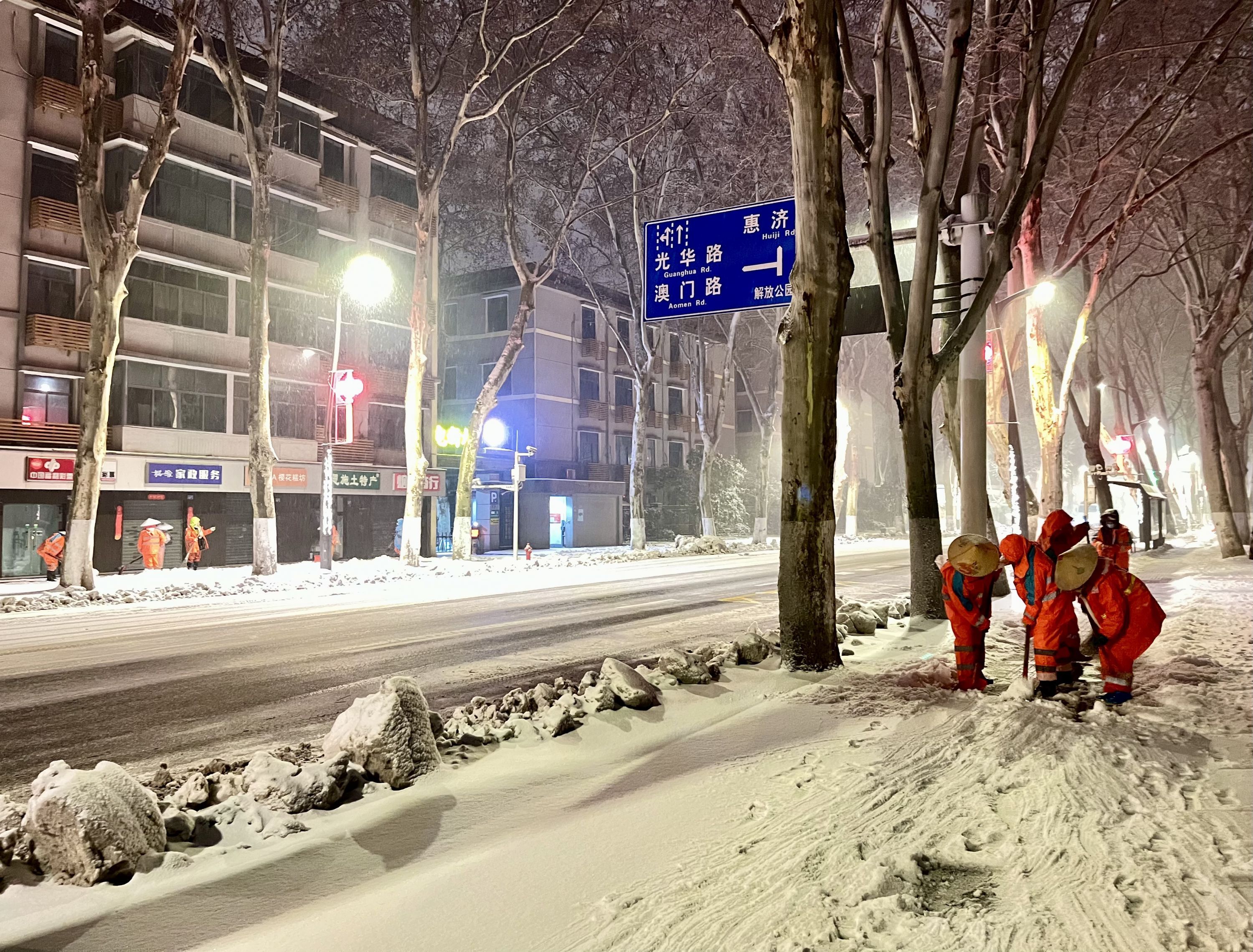 从2日晚开始,城管部门对重大交通枢纽、主干道及人流车流较大区域开展融雪除冰作业,在火车站、客运站等重点交通枢纽,在跨江桥梁、环线高架、立交匝道、主次干道播撒融雪剂,大型雪铲车随处可见。身穿橘色马甲的数千位环卫工顶风冒雪,在街头清除积雪。