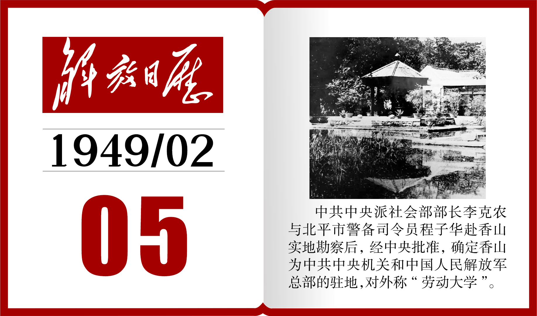 1949年的今天,香山被确定为中共中央机关和中国人民解放军总部的驻地丨解放日历 ©原创 2024-02-05 11:38 0 图片来源:香山革命纪念馆 整理:朱晨颖 设计:陈昌 制作:张莉 【编辑:戴容】
