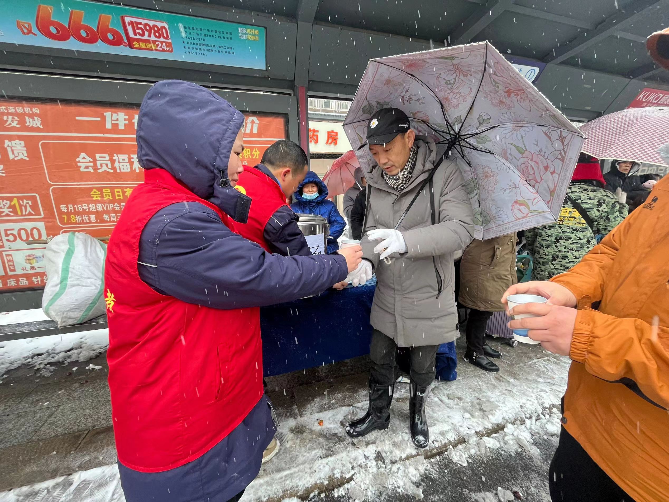 在罗家嘴公交车站,志愿者正在给现场候车的乘客进行“武汉公交APP”现场教学。袁建明说,现在集团有超过3000名党员和志愿者深入一线铲雪除冰,服务乘客、保障公交线路正常运转。当天一大早,武汉公交Y301、Y313路司机陶宏炎、吴小铁、金涛就提前熬制了红糖姜水,送到新洲阳逻客运站公交站点,给大雪中候车乘客、道路上辛勤工作的环卫工及返乡的务工人员带去温暖。