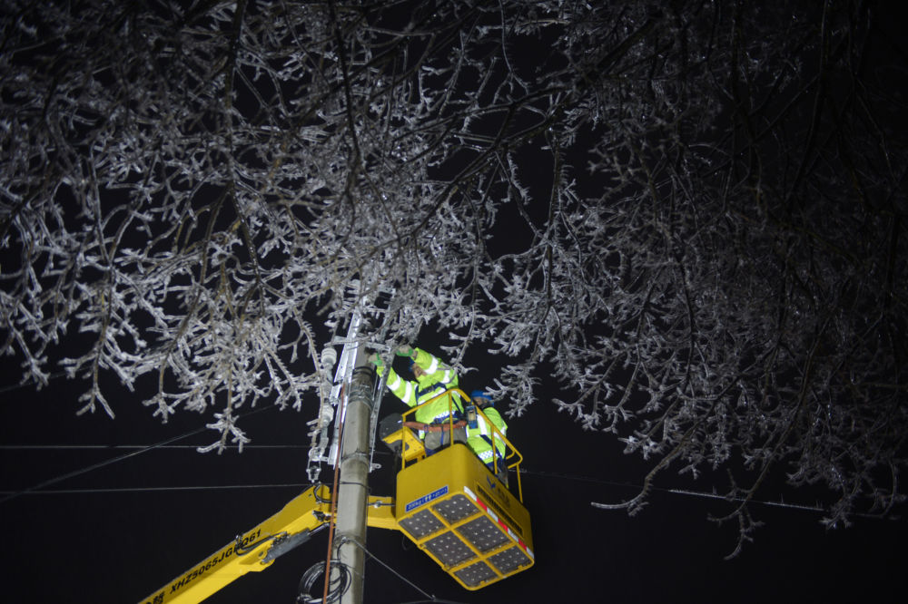 2月6日深夜,国网武汉供电公司工作人员在江夏区纸坊街道青龙山社区附近抢修供电线路。新华社发(王欣摄)