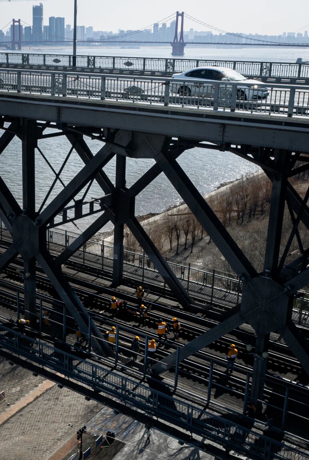 2月12日,武汉长江大桥桥梁车间员工陈卿明(左)、赵福武在武汉长江大桥上巡检。(朱丛蓓 摄)
