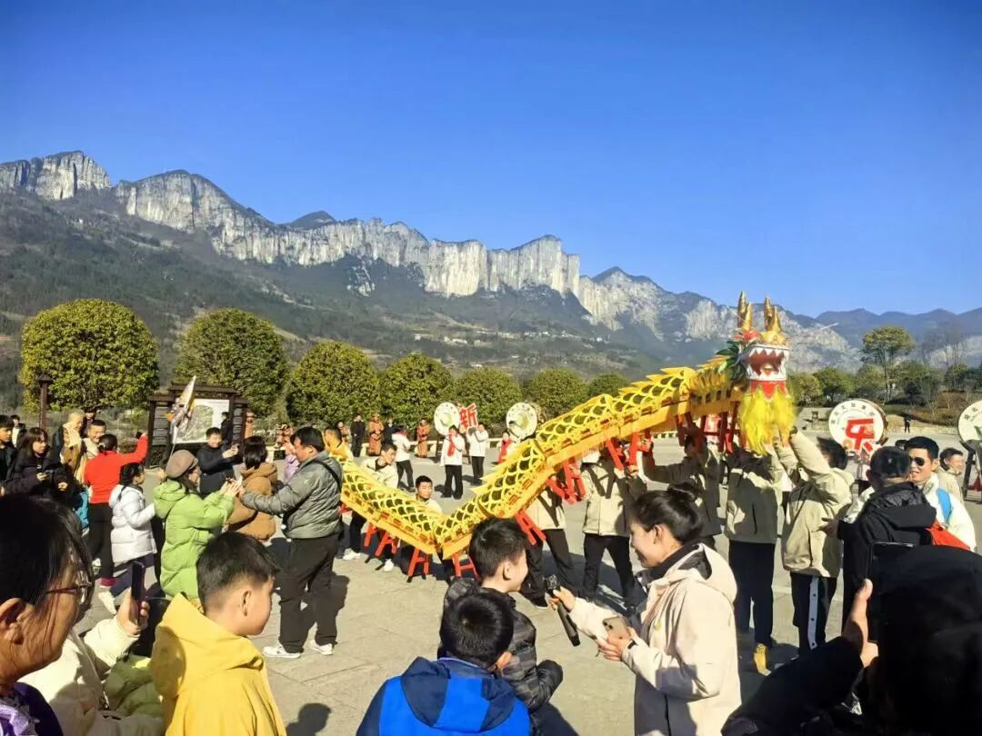 恩施大峡谷舞龙舞狮表演,吸引众多游客观看