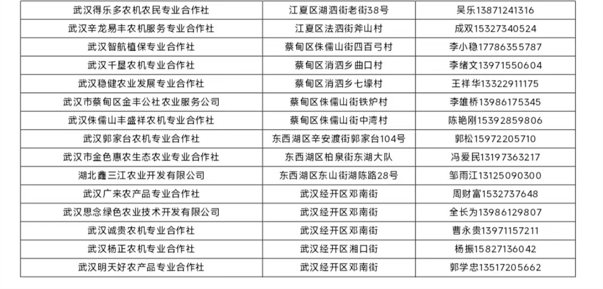 长江日报大武汉客户端2月18日讯(记者余康庭 通讯员王璐)根据气象部门预测,武汉即将迎来新一轮低温雨雪冰冻灾害天气。18日,武汉市农业农村局遴选出28个农机作业服务组织(见下表),成立武汉市农用无人机应急作业服务队。冰雪天气时,蔬菜大棚、农业厂房等若有需求,可联系这些服务队进行融雪除冰作业服务,保障农业生产。