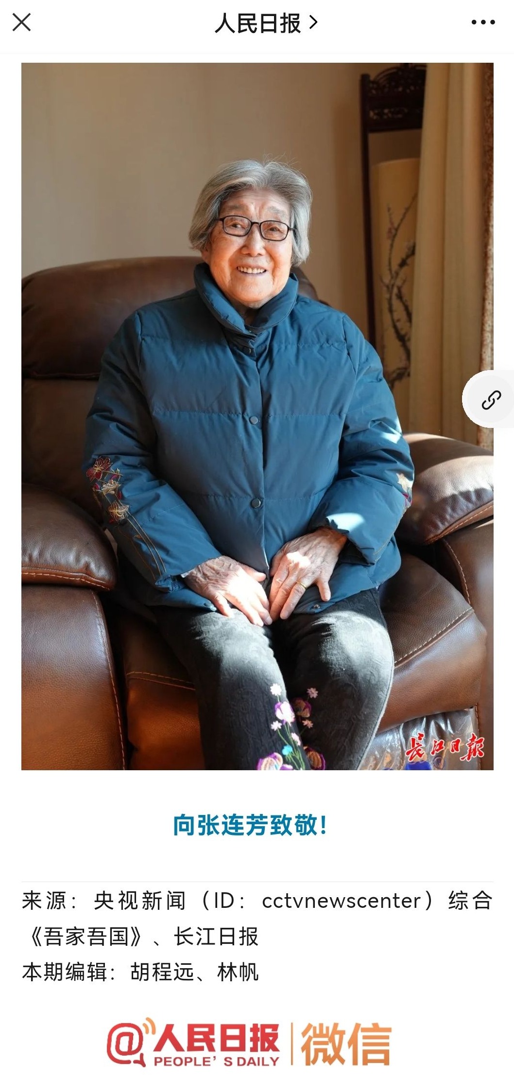 据悉,张连芳目前是武汉市军休六中心军休干部,今年已近九旬高龄。她是新中国第二代女飞行员,曾参加第一次、第二次原子弹爆炸试验任务,作为飞机领航员,和机组成员一起两度采集蘑菇云辐射微粒,将生死置之度外,为我国分析核爆试验成果提供了第一手资料。