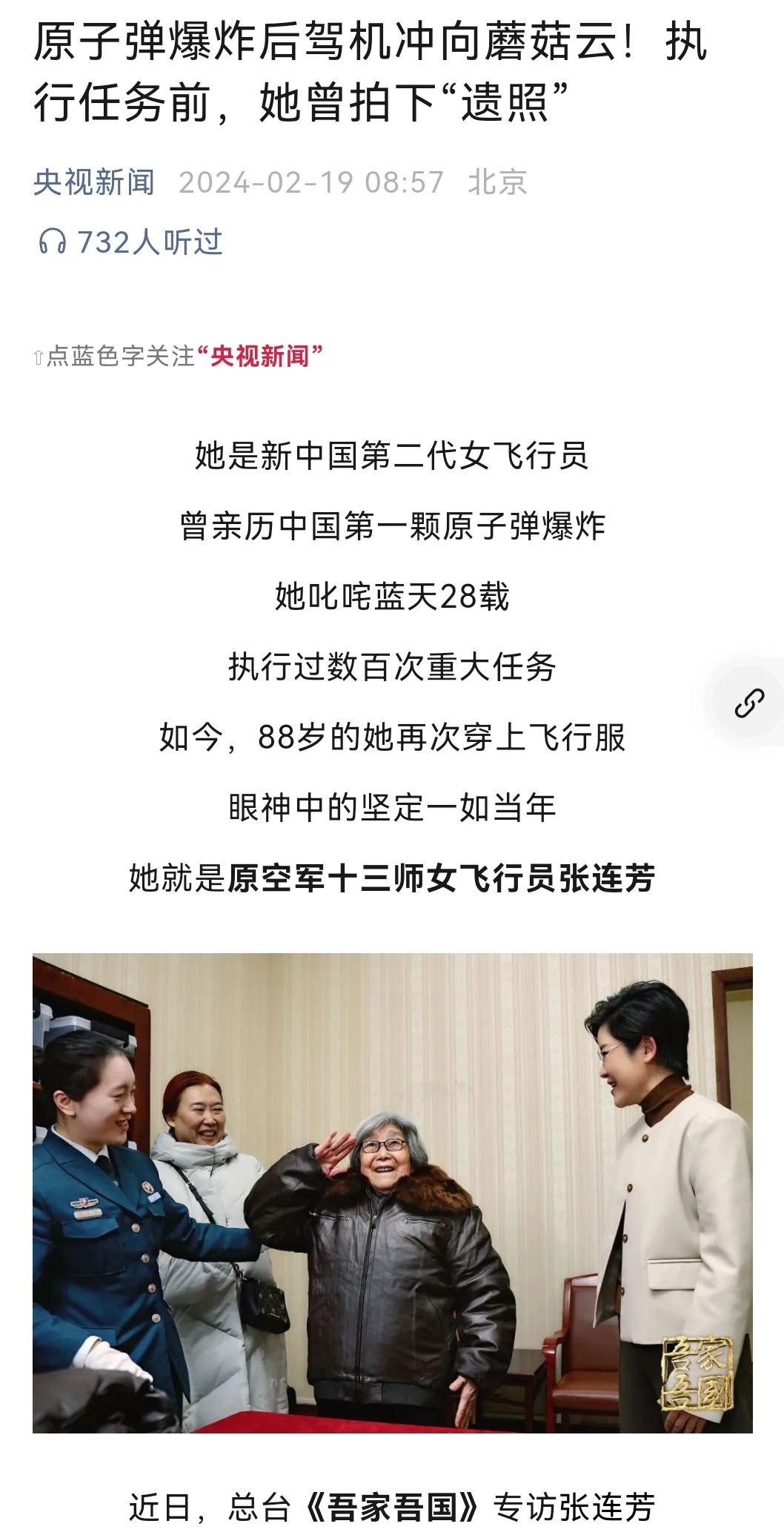 18日晚,央视《吾家吾国》栏目用半小时的时间讲述张连芳“驾机冲向蘑菇云”的惊险经历。