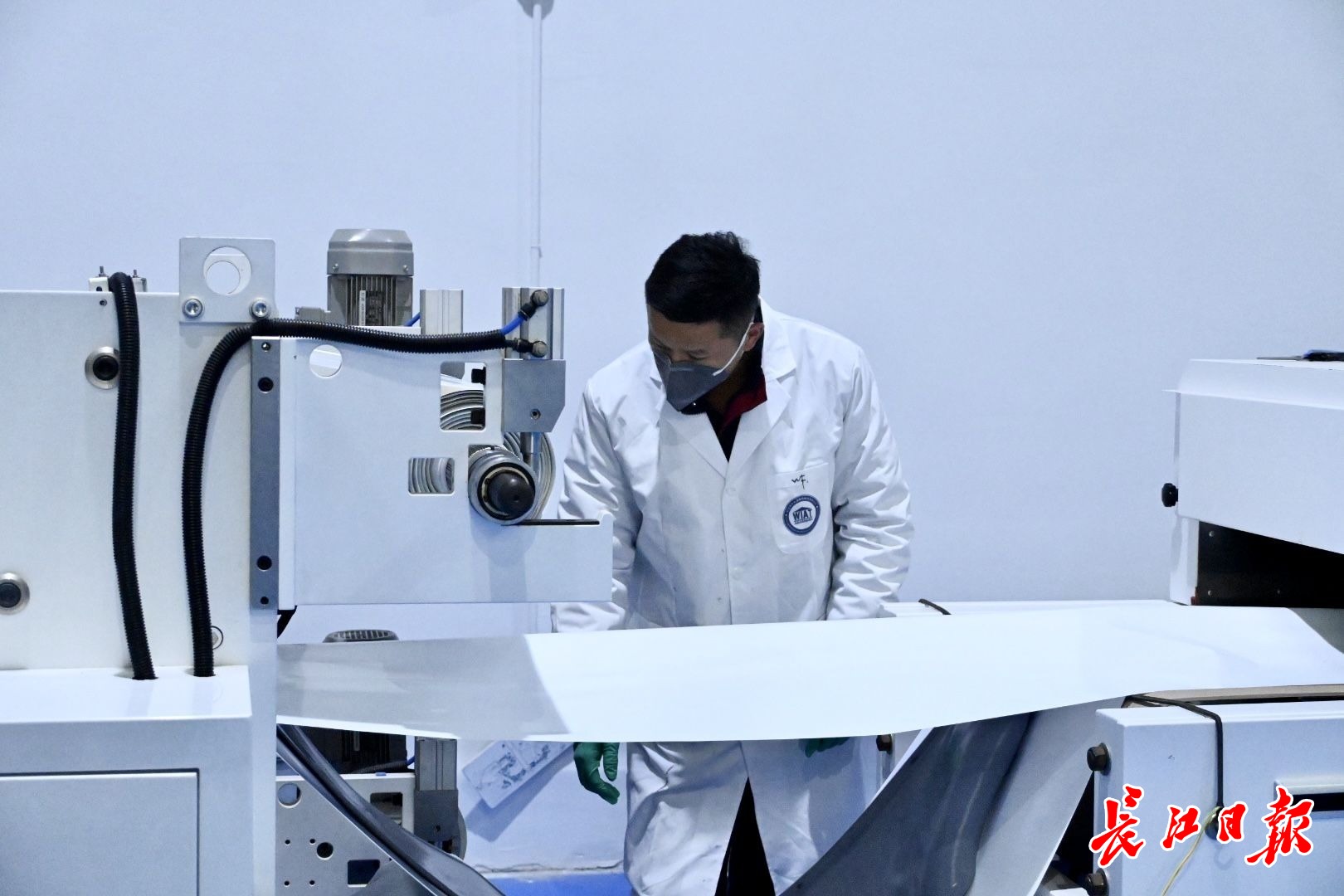 记者进入中试基地左手侧,只见两名研发人员正操作着一条狭长的生产线,将一张张透明的膜放入产线一端。