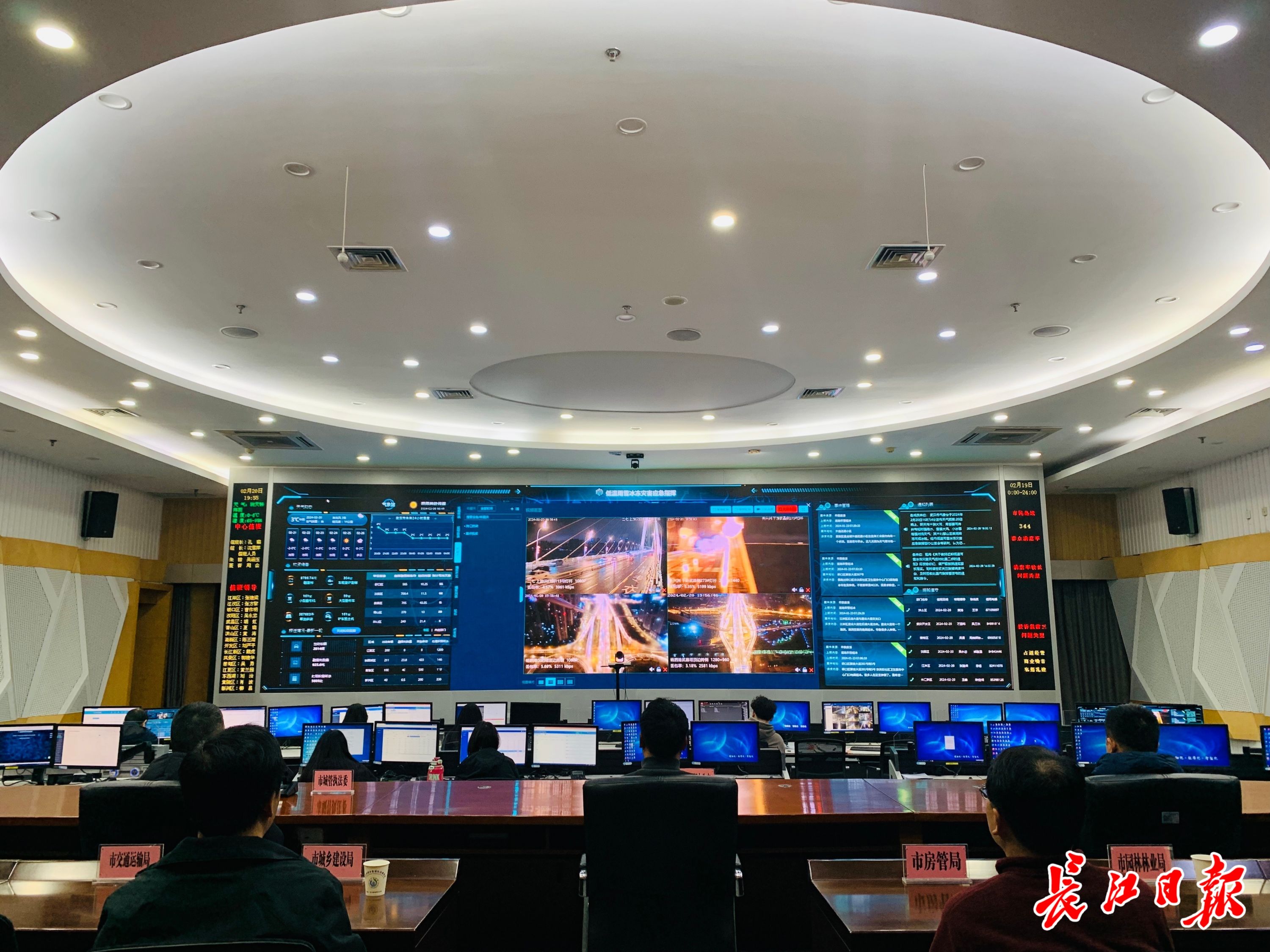 当晚,指挥调度大厅灯火通明,所有工作人员紧盯大屏幕,观察全市道路、桥梁情况。记者现场看到,大屏幕上显示长江大桥、江汉一桥、解放大道、欢乐大道等道路畅通。