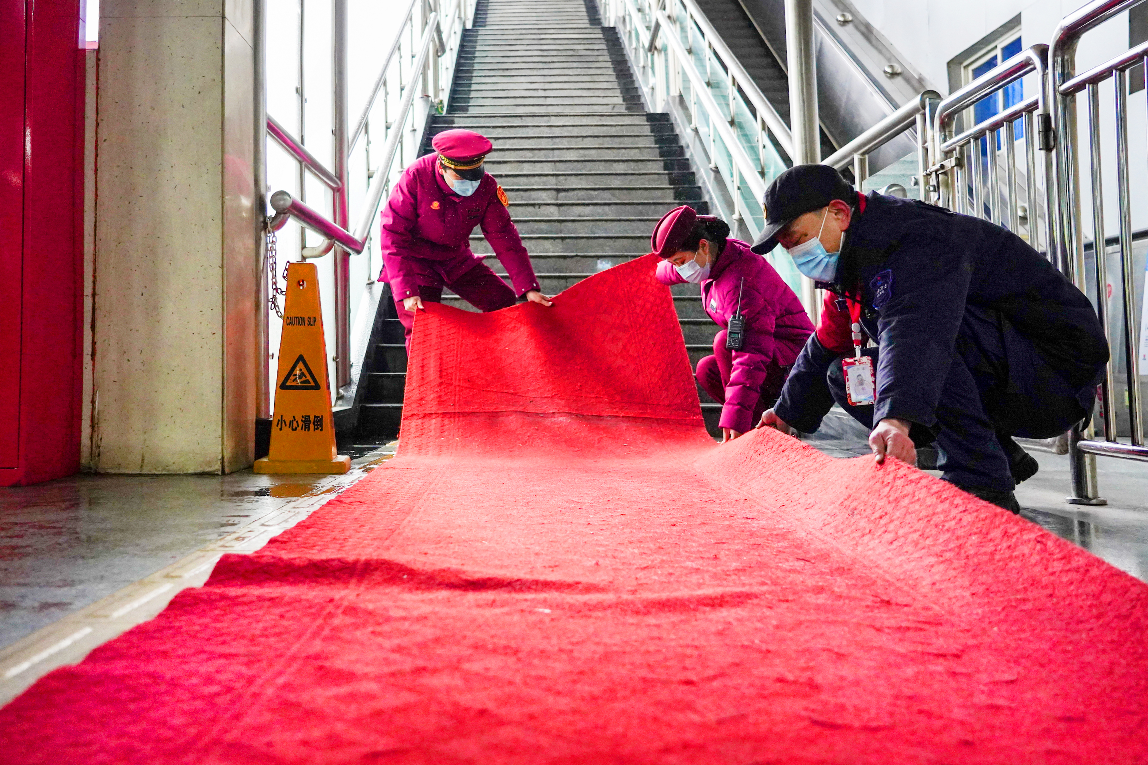 21日早晨,1号线循礼门站工作人员在楼梯口铺设防滑毯。通讯员李周密 摄
