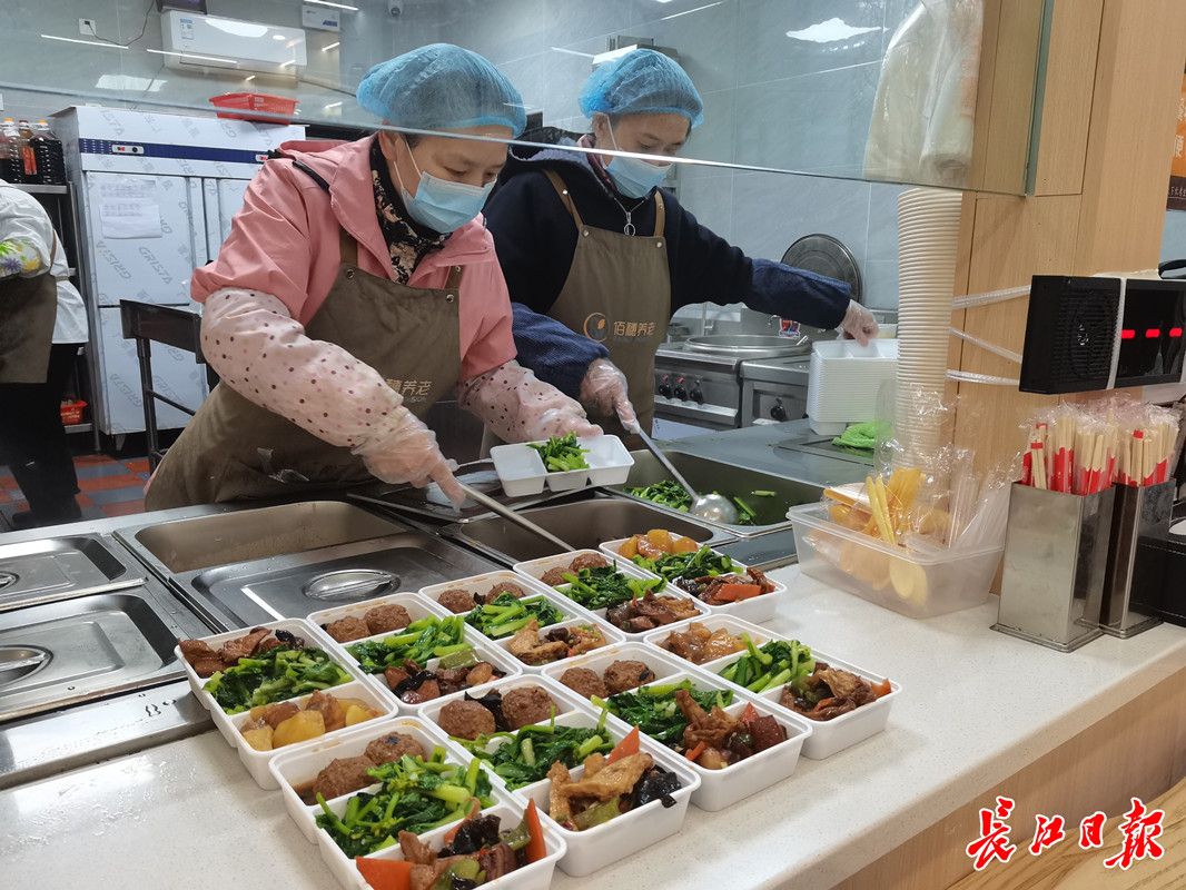 烩三鲜、红烧狮子头、土豆烧鸡、干煸鱼块、卤藕回锅肉……当天上午10时,江岸区劳动街道惠中社区食堂的菜品已陆续出锅,“90后”送餐员王琼打包了23份盒饭装进两个保温箱,分别放在电动车的踏板上和后备箱里。