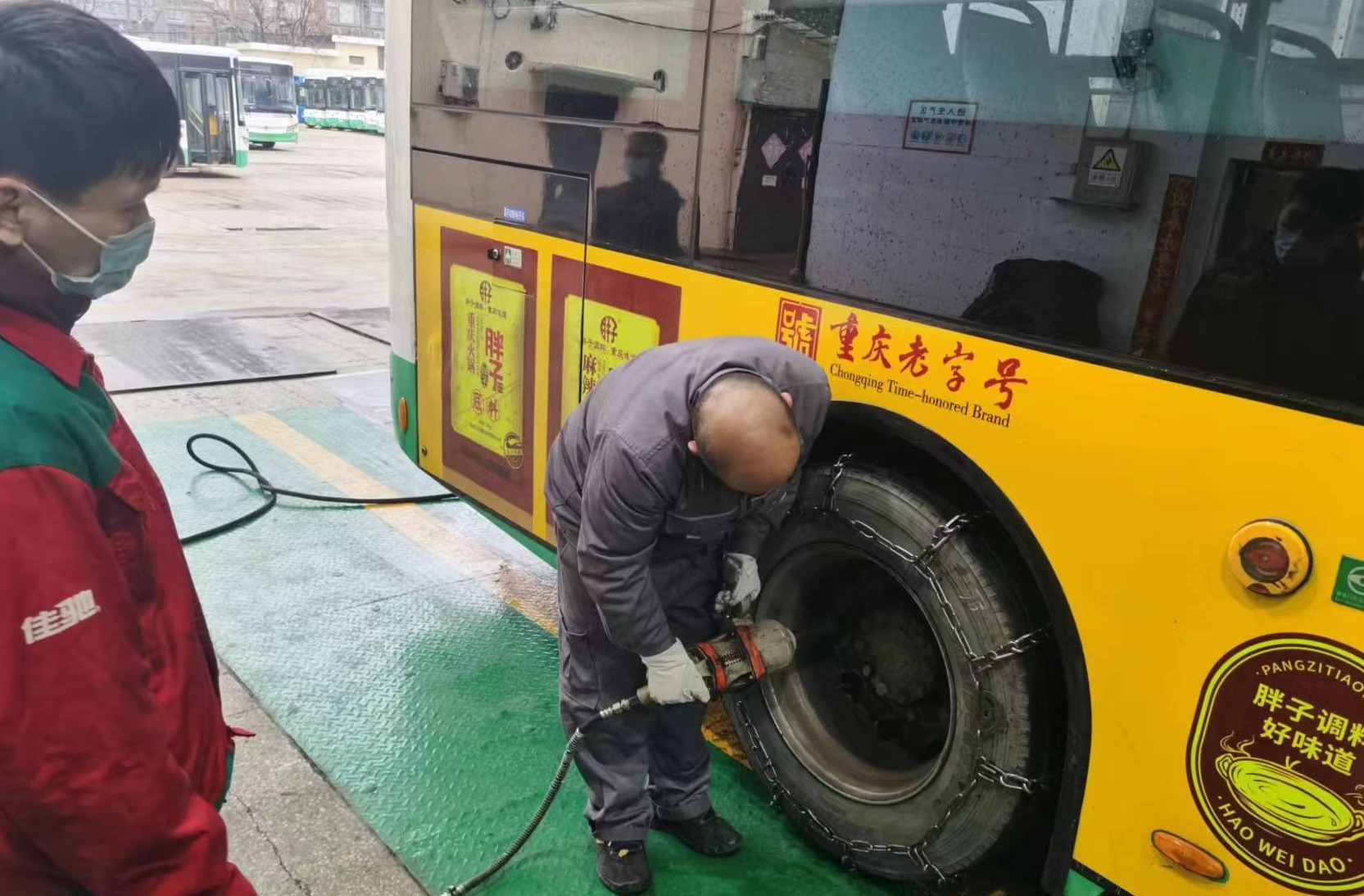 当天下午,武汉公交集团第二营运公司保修分公司应急小分队成员陈拥军、李剑双、陈祥为也对汉口火车站保运线路的736路、703路部分车辆更换了带防滑链条的轮胎。在保修车间,他们三人分工合作,支起千斤顶、挂装链条、加固链扣……一套挂装操作行云流水。