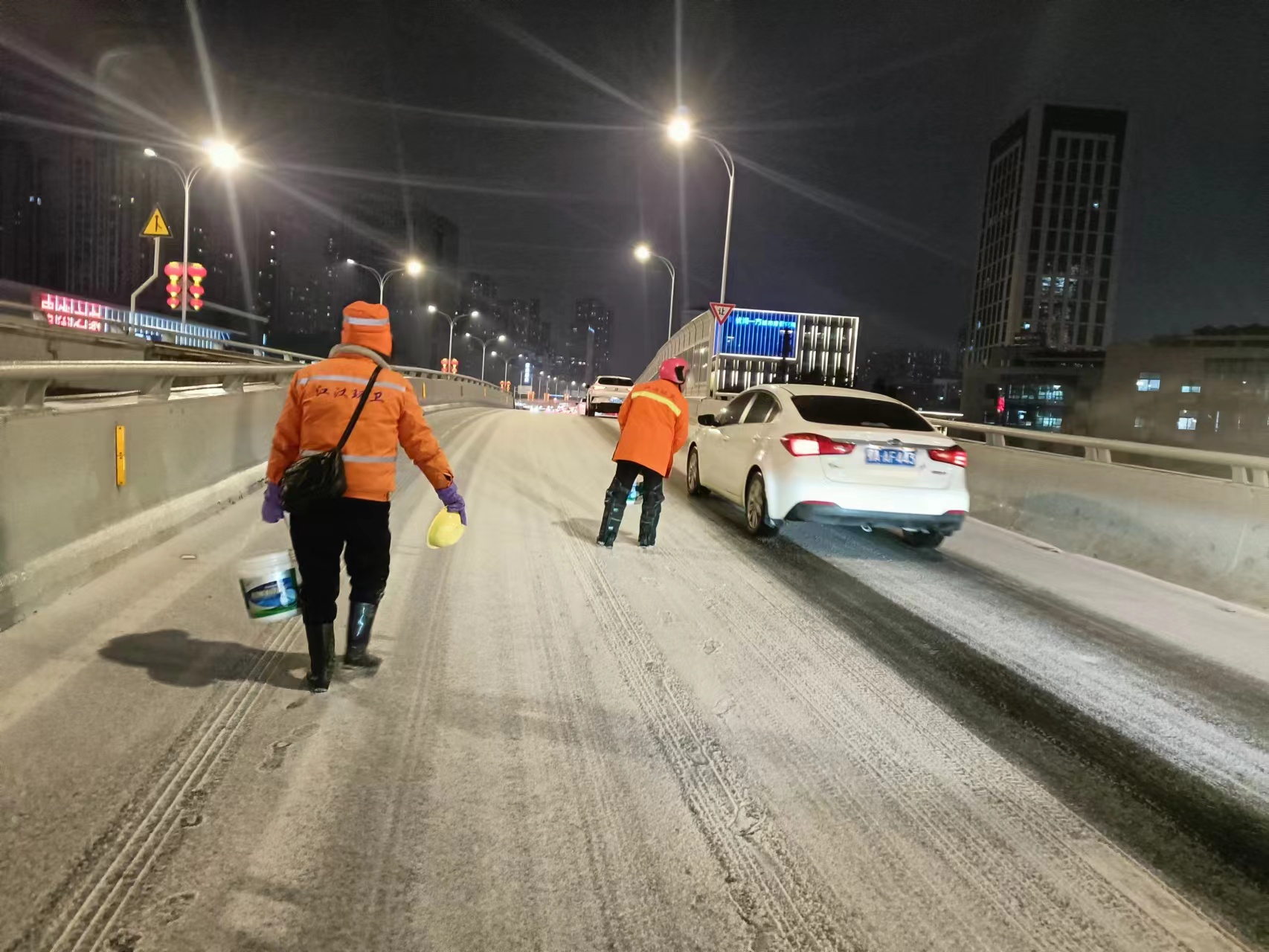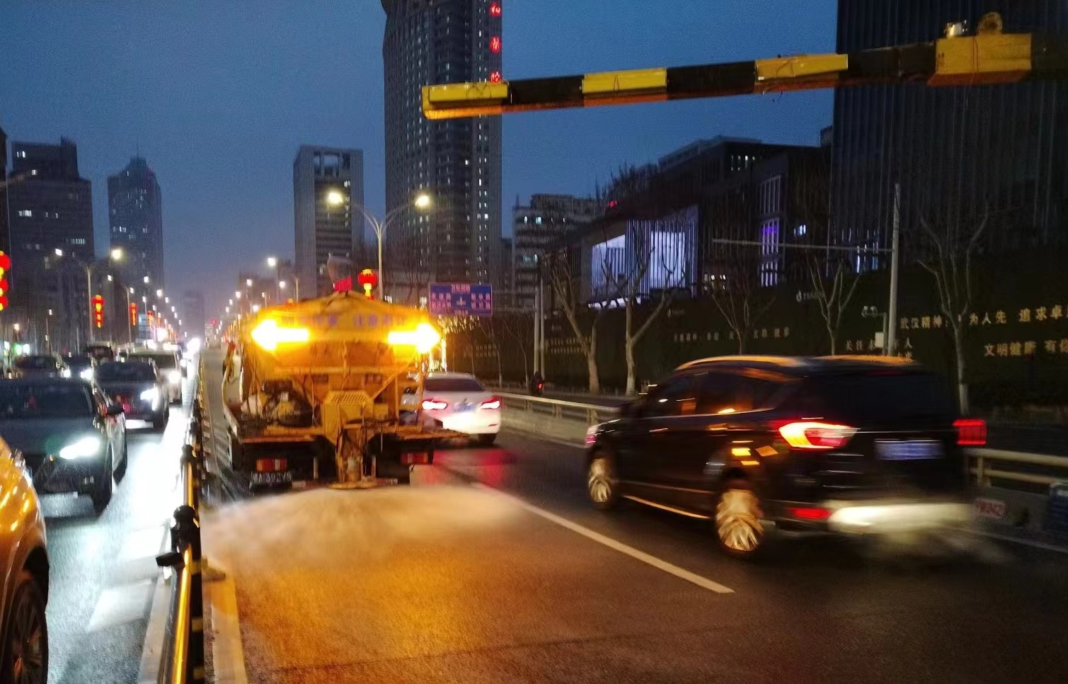 长江日报大武汉客户端2月21日讯 2月21日晚6时起,武汉开始下冰粒,江汉区城管执法局对辖区机场二通道、汉江大道等重点高架、环线匝道、路面再撒融雪剂,并出动雪滚车清除路面积雪薄冰,做到“随下随扫”。