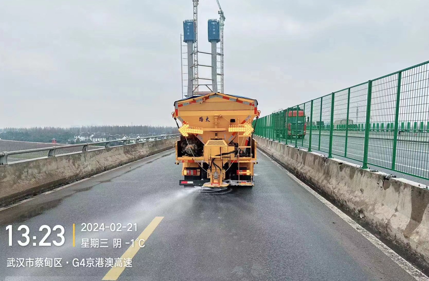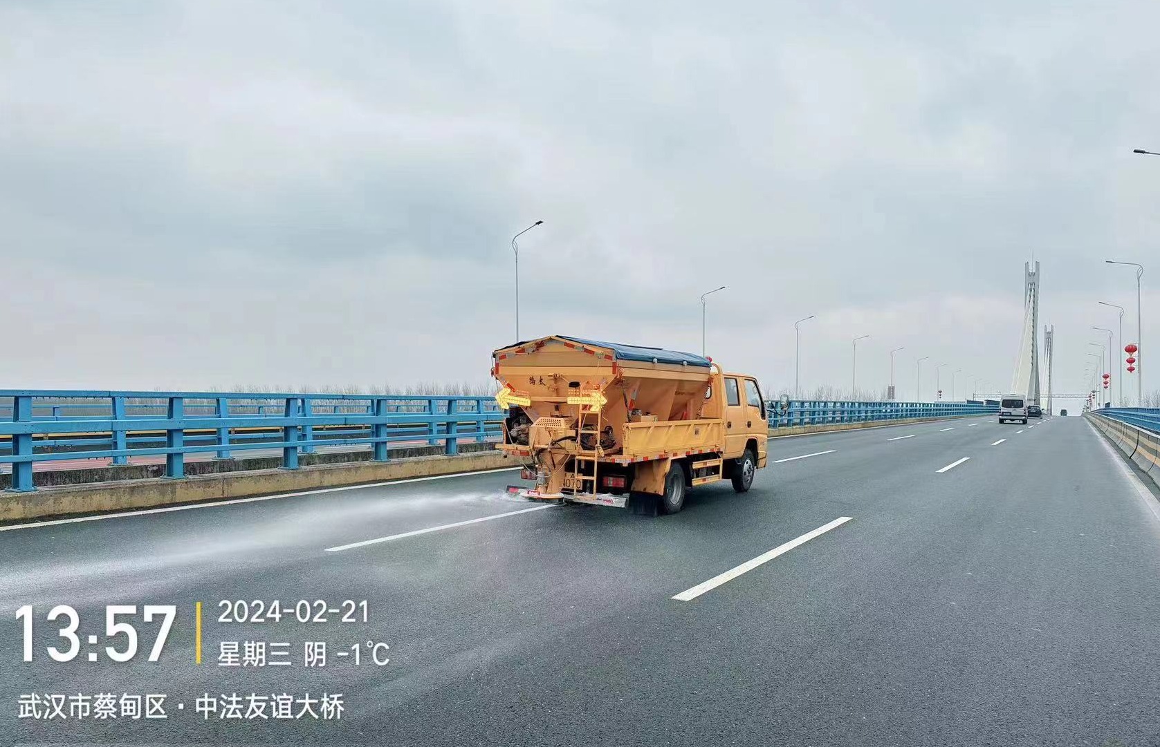 中午1时许,气温已经降至0℃以下,环卫人员驾驶撒布机迅速出动,对中法友谊大桥、京港澳高速公路旁的便桥开展撒融雪剂防冻作业。蔡甸区城管执法局环卫科副科长彭涛介绍:“中法友谊大桥、京港澳高速公路旁的便桥都是横跨汉江的桥梁,根据以往经验,桥面容易结冰,我们撒融雪剂防止结冰,方便蔡甸区与东西湖区之间正常通行。”