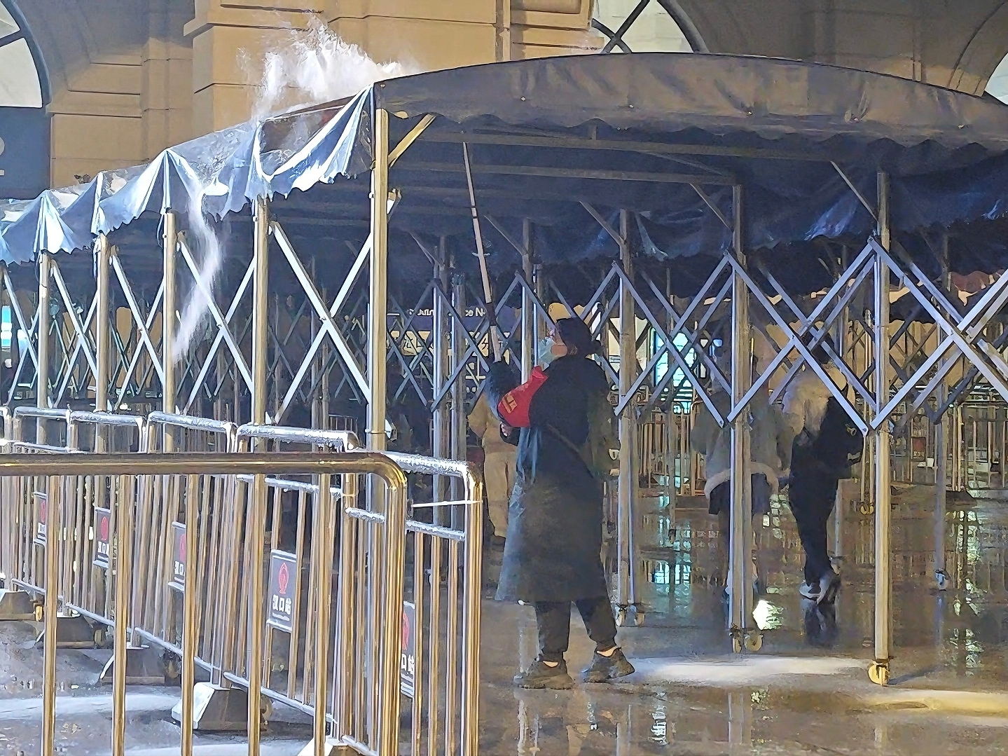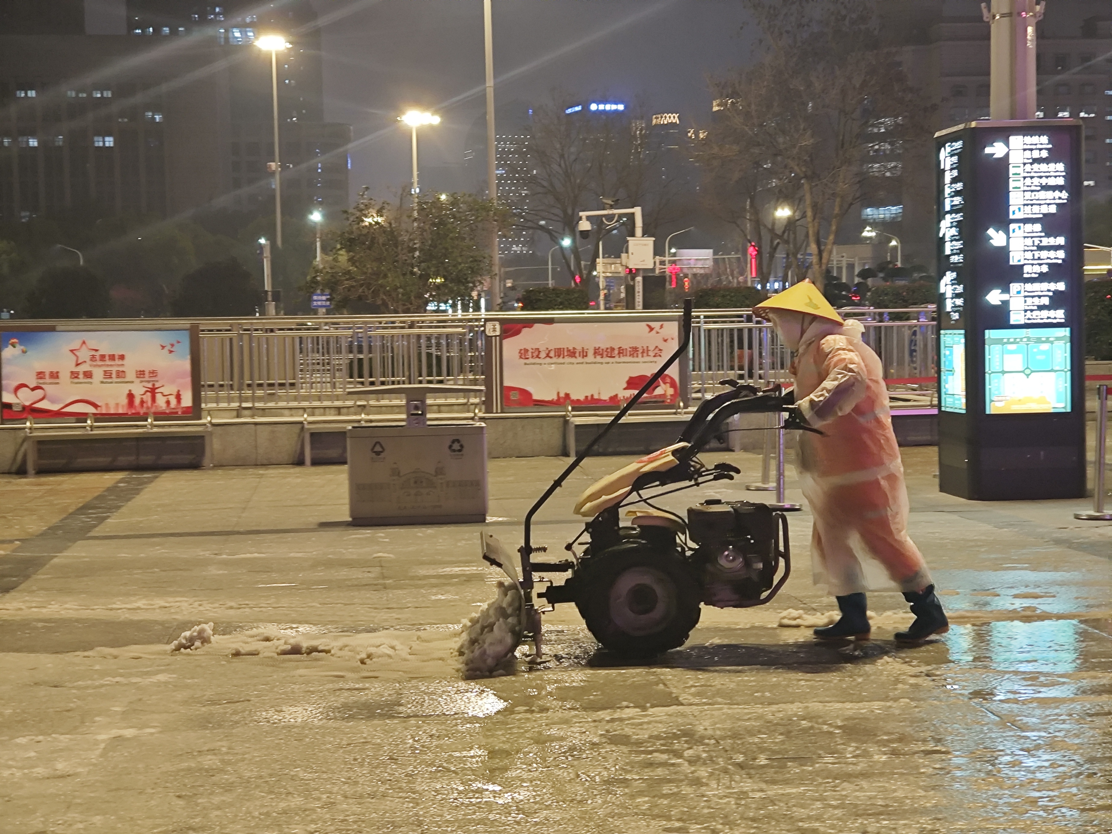 冰粒越下越急,广场上的工作人员也越来越多,手持铁铲簸箕,推着斗车铲车,拿着麻袋草垫,各司其职,优先保障旅客必行的进出口畅通。