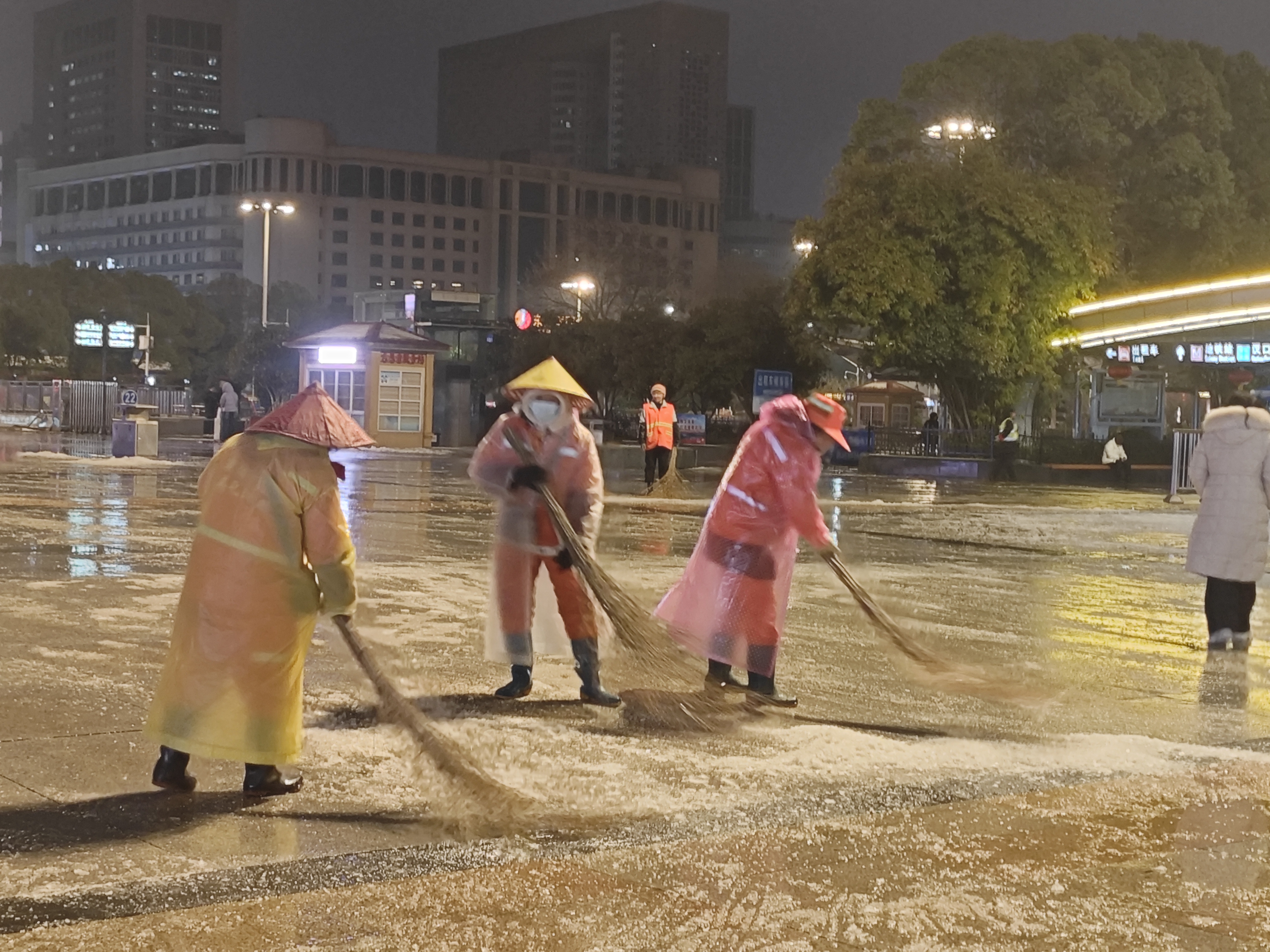 19时许,冰粒渐小渐停,汉口火车站广场上工作人员一刻也不停歇,环卫工人拿着大扫帚,清理冰雪,并铺撒融雪盐。20时,记者看到,进站口前地面已无明显冰雪,旅客出行较为顺利通畅。