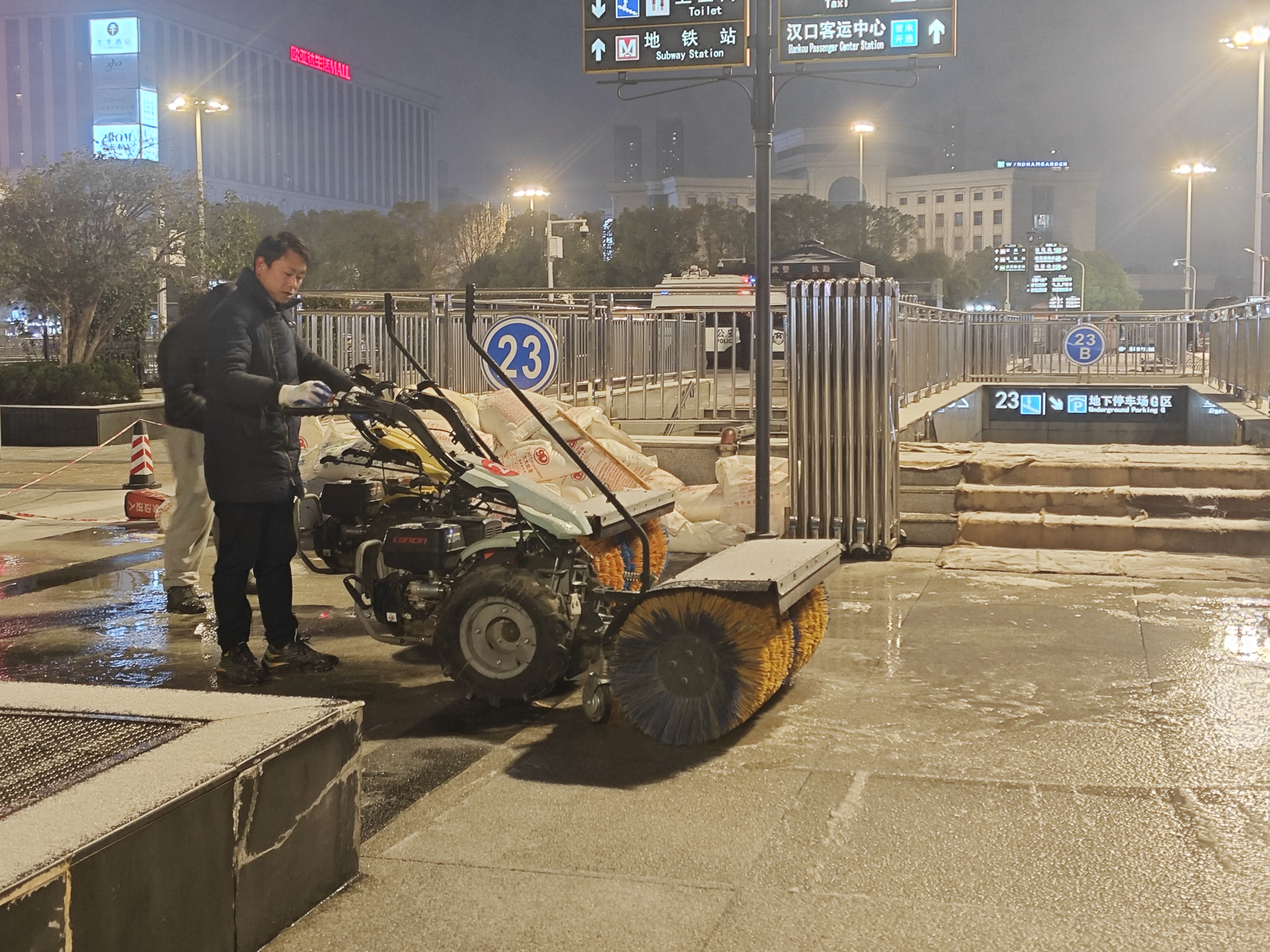 汉口火车站综管办工作人员介绍,18时一听到冰粒落下的声音,执勤人员便迅速出动,铺撒融雪盐,及时铲冰除雪,“1台手推铲雪车和2台手推滚雪车都出动了,若地面积雪再深,高效率的除雪推车以及铲车也已准备就绪”。