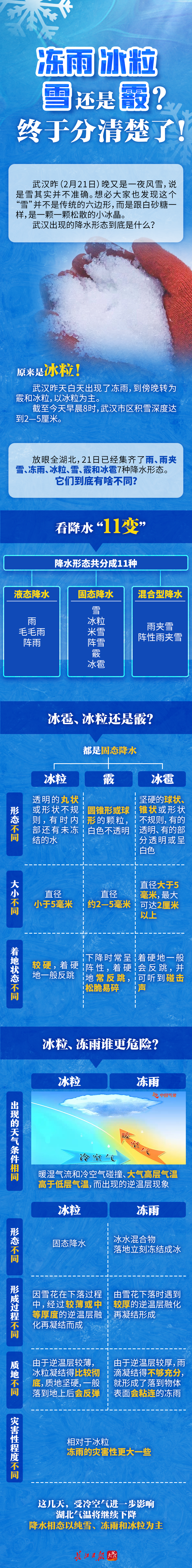 武汉人担心的冻雨没怎么下,冰粒却噼里啪啦下了一夜。2月22日,武汉市区气温降至-3℃,地面明显结冰积雪。放眼湖北省内,21日已出现了雨、雨夹雪、冻雨、冰粒、雪、霰和冰雹7种降水形态。它们有何不同?省气象专家对其进行解读。