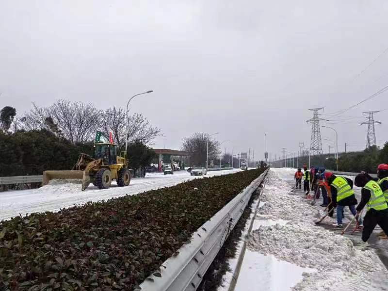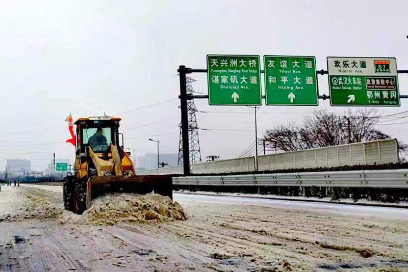 2月22日,武汉地铁集团组织300余人突击队,驾驶30台铲车在三环线东段清除积雪,疏导交通,局部堵点正在消除。大型推土机变身为推雪车,积雪扬起,“犁出”道路本色。紧接着作业人员迅速把积雪往道路两边铲,扩宽除雪面积。大型设备前方开路,作业人员迅速扩大铲路面积。