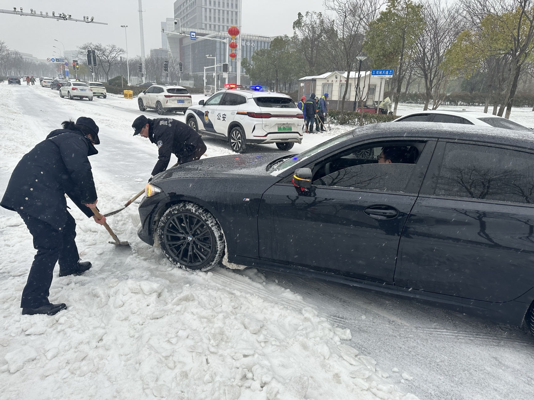 上午8时许,一辆前往花山方向准备上班、行驶在严西湖大桥上的小车被困,由于雪深路面较滑,车辆偏向驶入路边,陷于冰雪之中。车主尝试自救脱困,几番努力后车辆轮胎越陷越深,严重偏离主干道路行驶方向。芦浩、吴新宇先用铁锹将车辆底盘和轮胎前后的积雪清理出来,然后在轮胎前后垫上石块和树枝等物品,提高车辆轮胎的摩擦力,最后一齐用力使劲推。两位民警一齐喊着口号“123,推……加油”,最终将被困车辆救出。看着民警被冻得通红的双手,车主摇下车窗,连声道谢:“今天幸好有你们及时帮忙,否则我的车可能撞向桥栏,导致惨重损失。太感谢你们了!”