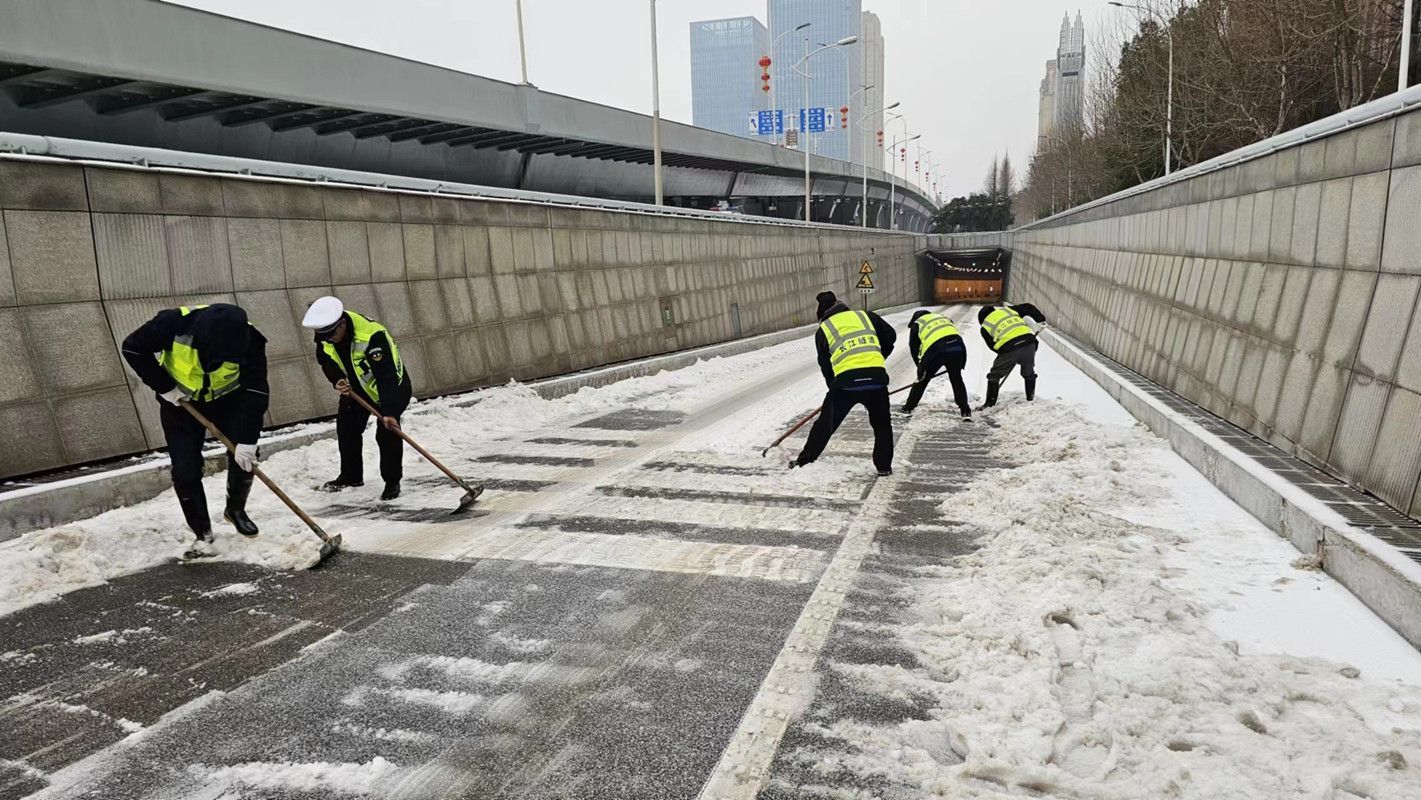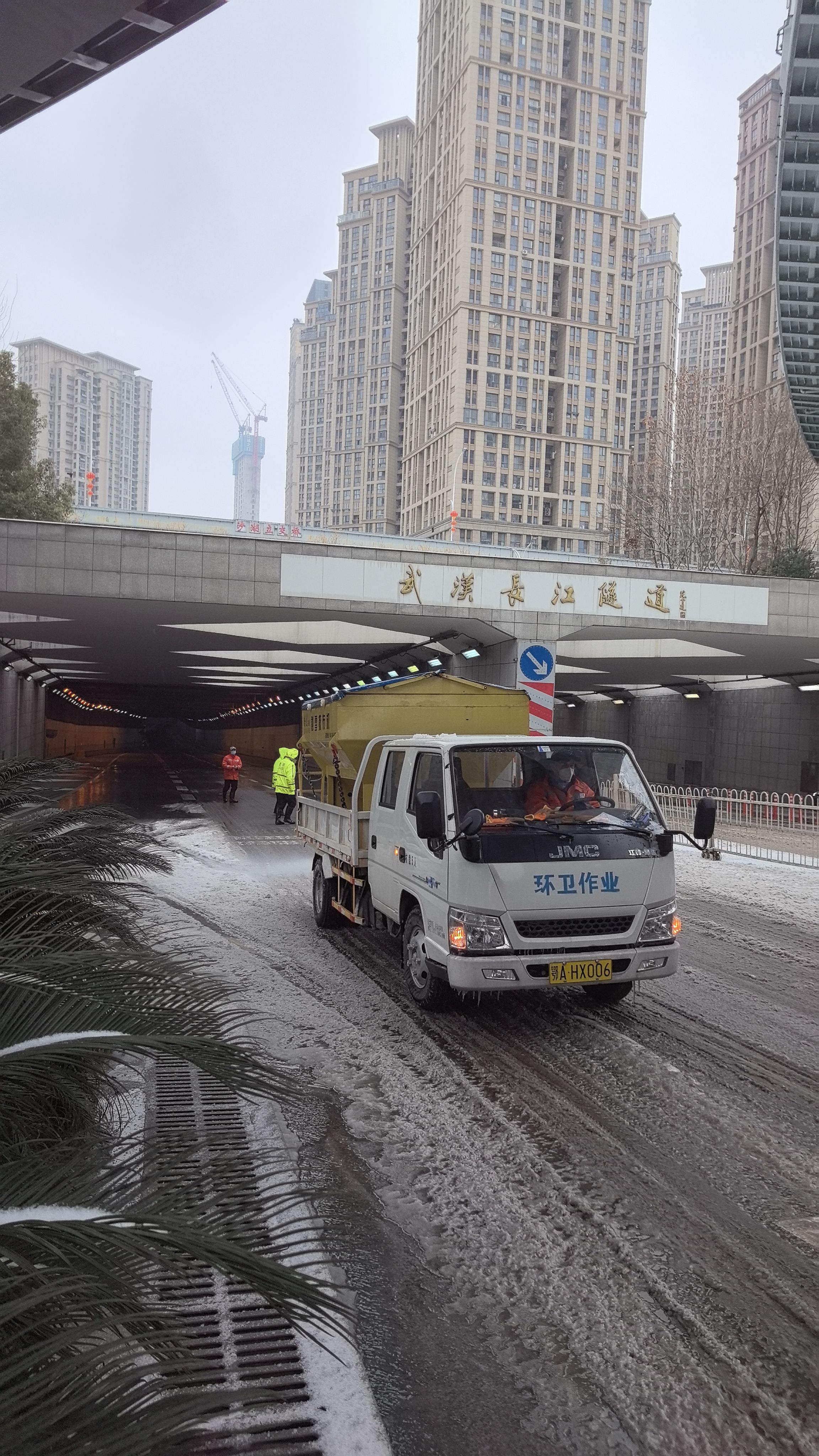 针对新一轮低温雨雪冰冻天气,长江隧道建设有限公司在隧道所有进出口以及匝道敞开路段提前预置除雪队伍、设备和融雪剂,坚持“以人等雪、随下随清”,并根据实际天气情况立即调整融雪除冰方案,由原先的直接撒布融雪剂改为先人工将冰粒铲除,后在冰层上撒布融雪剂,使融雪剂直接接触顽固冰层,全面提升除雪效率。