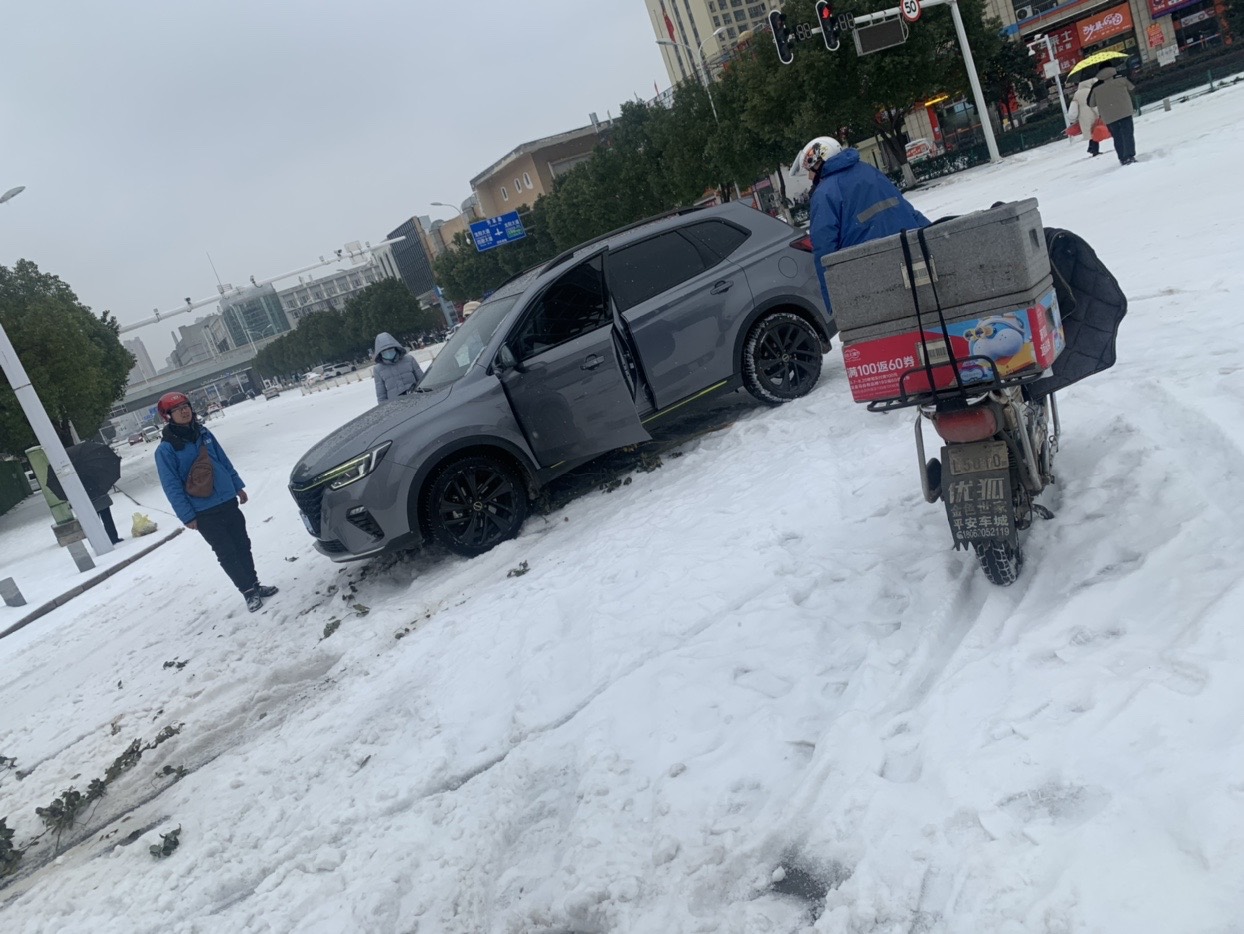 郑子豪骑着电动车穿梭在风雪中,雪地上的轮胎印迹见证了他的忙碌。