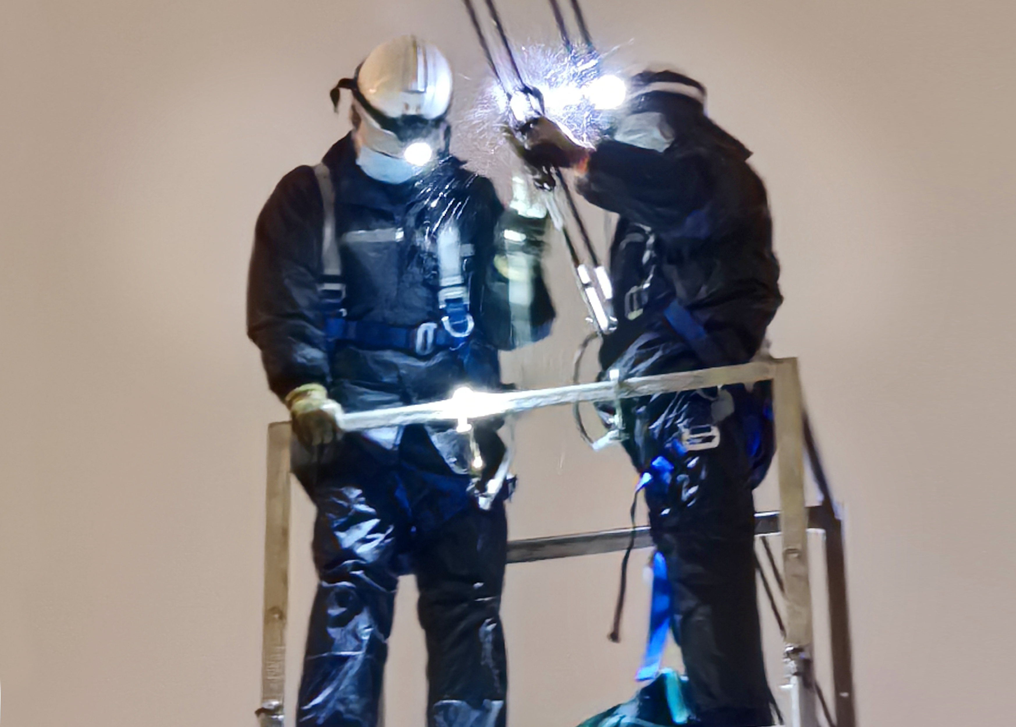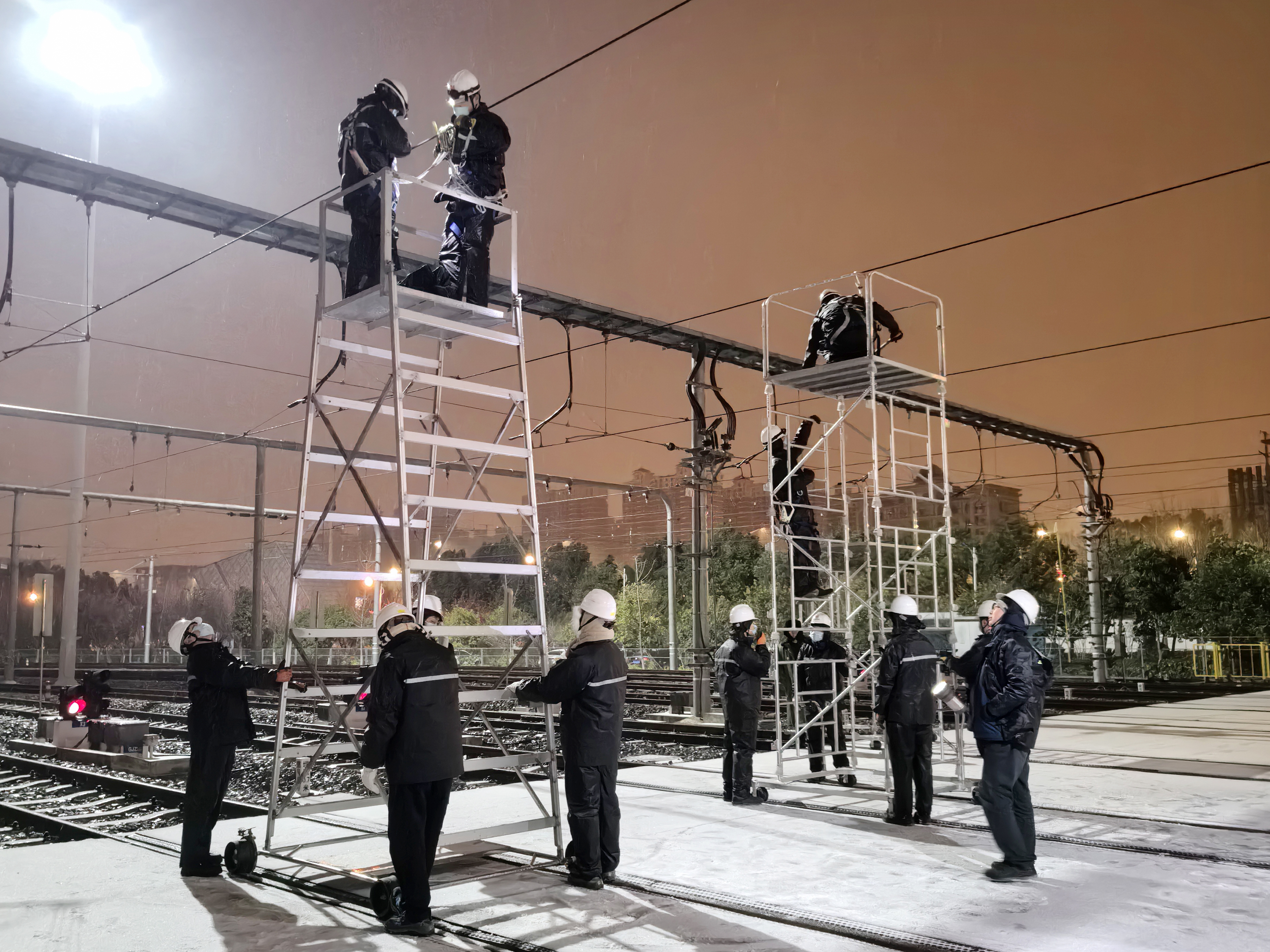22日凌晨,地铁供电专业人员对接触网进行除冰作业。通讯员产启斗 摄