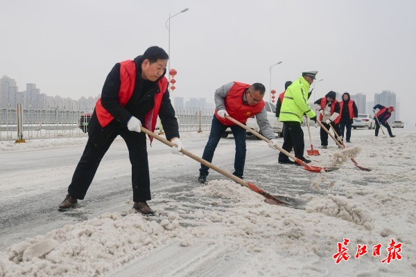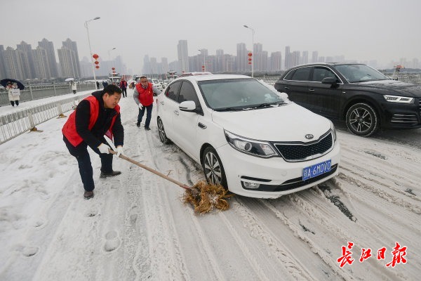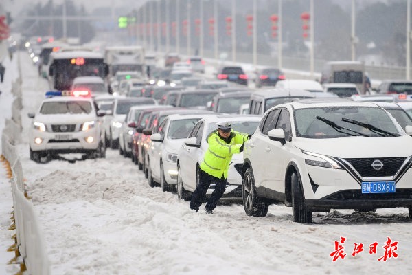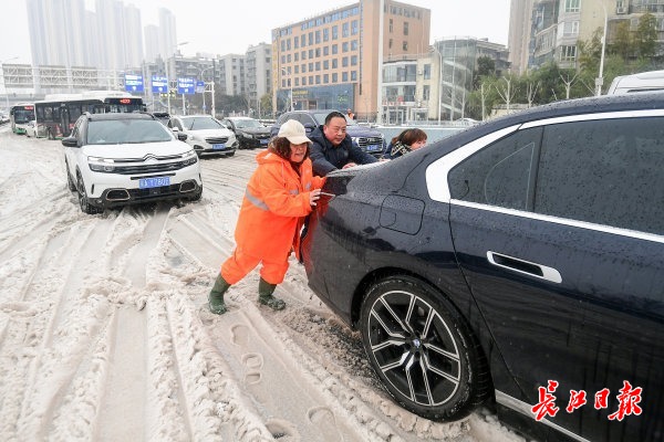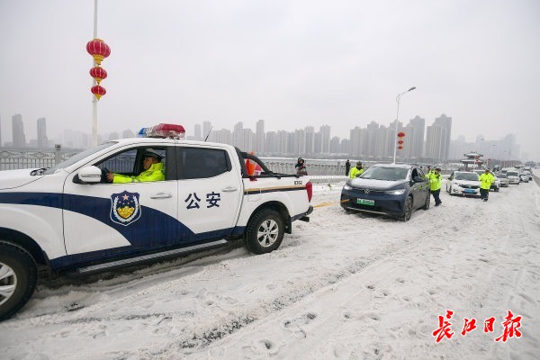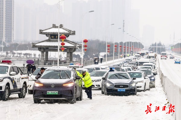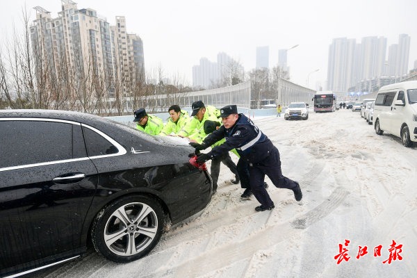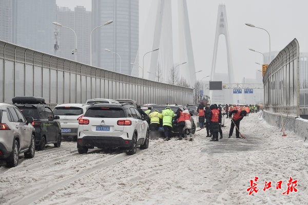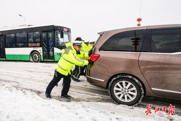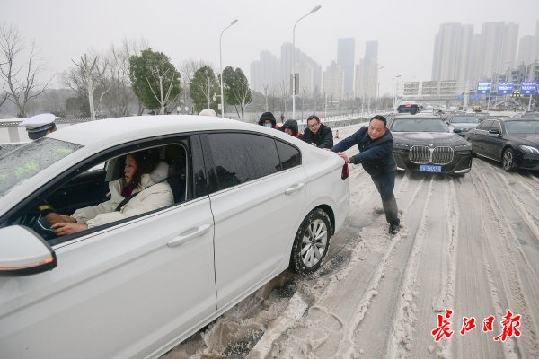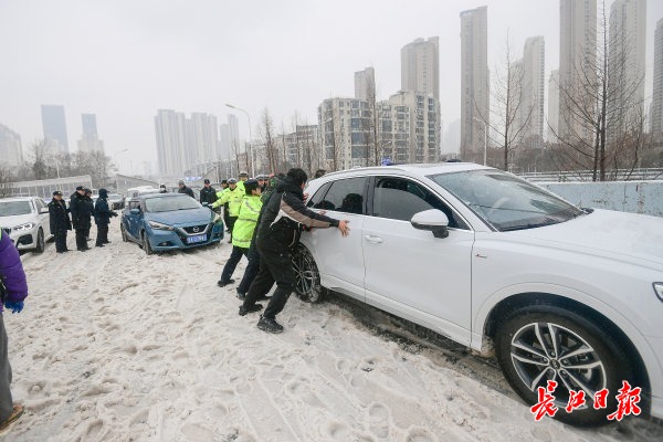 2月22日上午,受新一轮低温雨雪冰冻天气影响,武汉市汉阳区江城大道墨水湖大桥由南向北上桥路段及月湖桥上桥处积雪结冰,过往车辆通行受阻。汉阳区交通大队组织民辅警全员上阵,通过推车、拖车等多措并举帮助车辆脱困。道路沿线的汉阳区民政局、汉阳区城管委、晴川街道办、月湖派出所等单位也自发组成志愿者突击队,纷纷上路帮助受困车辆和群众,大家齐心协力保障交通平安通畅。