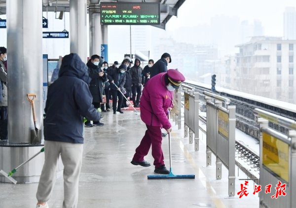 东吴大道轻轨站职工清除进站口的冰雪。长江日报记者喻志勇 摄