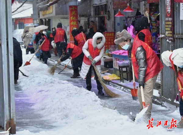宗关街变电社区干部和志愿者在清除街巷冰雪,方便居民出行。长江日报记者喻志勇 摄