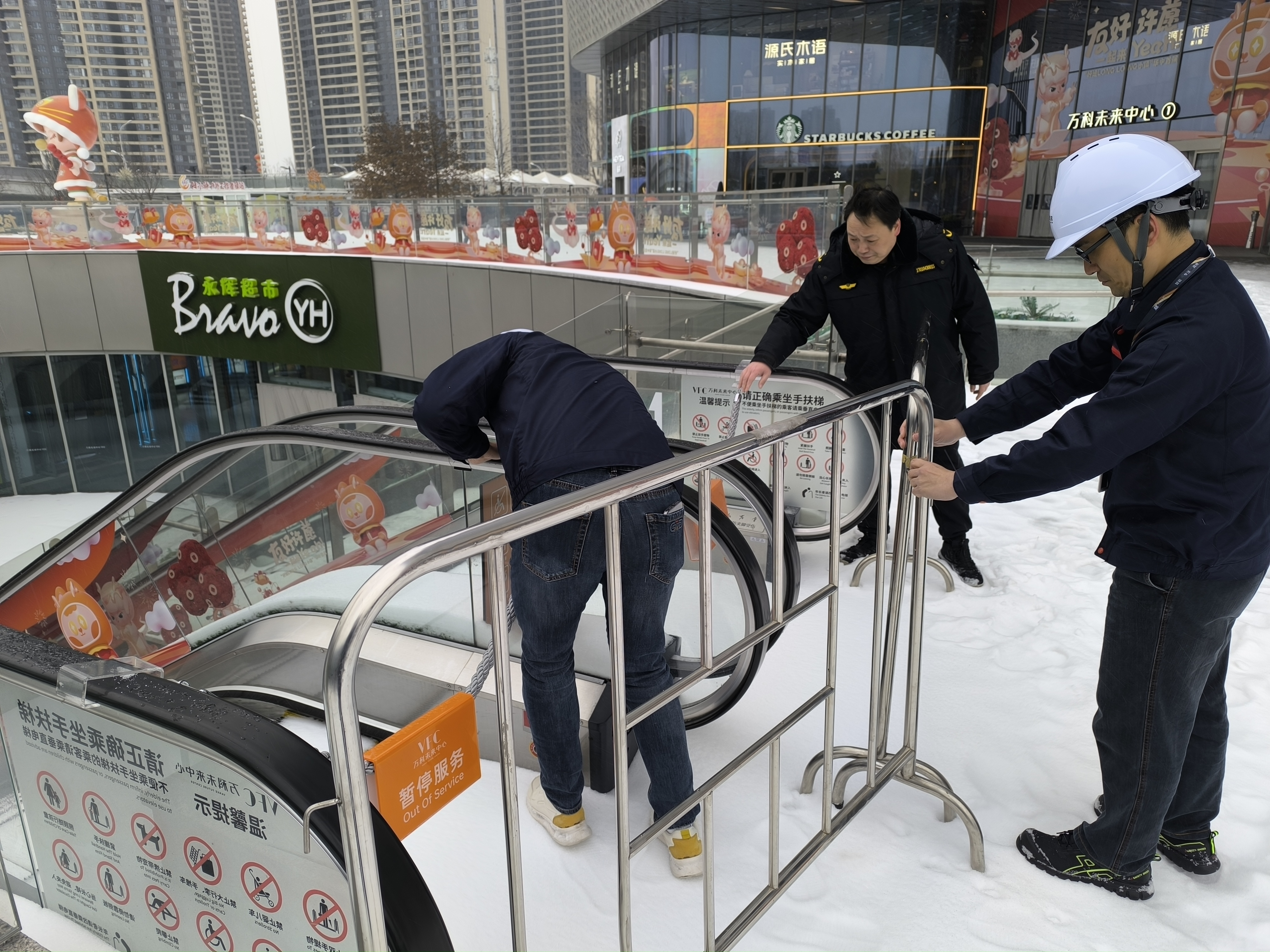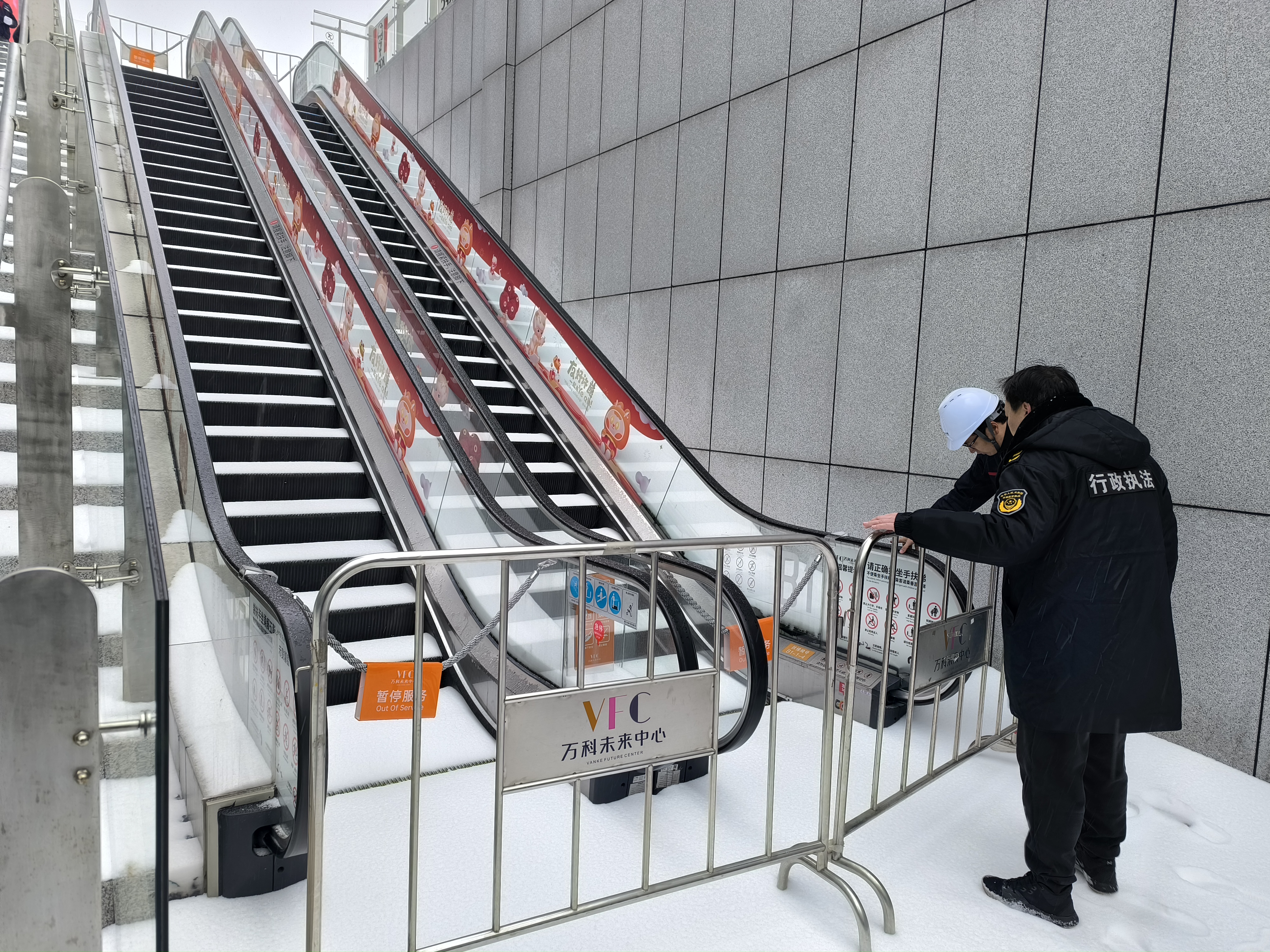 低温雨雪冰冻天气,市场监管人员巡查户外自动扶梯是否设置围挡。记者唐煜 摄