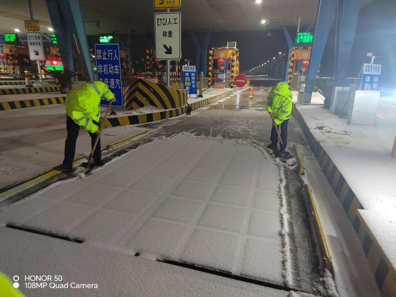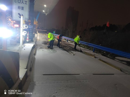 长江日报大武汉客户端2月22日讯(记者徐丹 通讯员魏兰)22日凌晨,汉蔡高速上,多名高速工作者正通宵奋战,除冰扫雪,全力保通保畅。