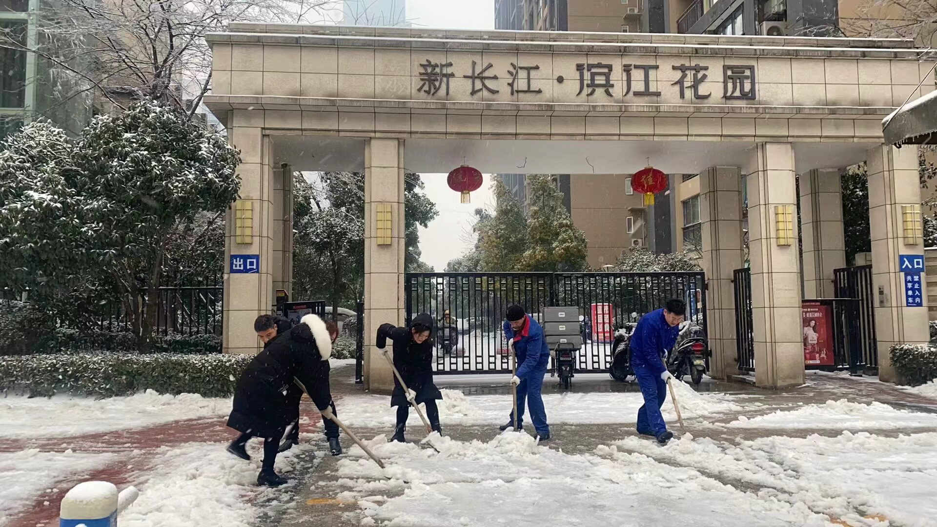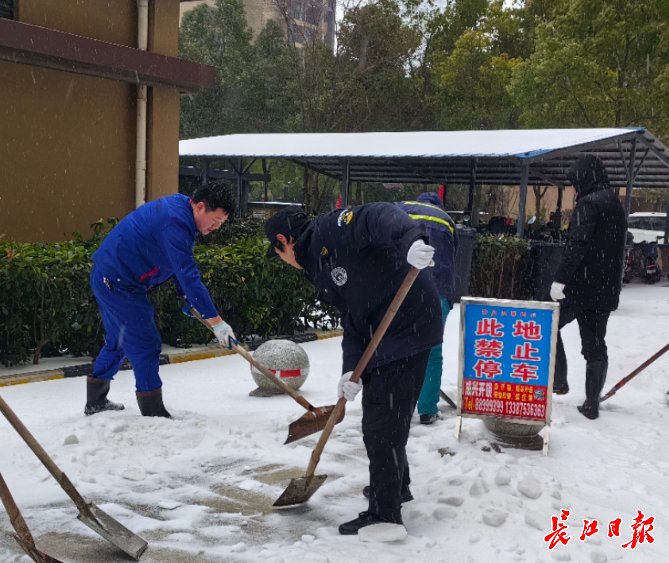 胡念(右一)和同事除雪。 (新长江滨江花园小区物业供图)