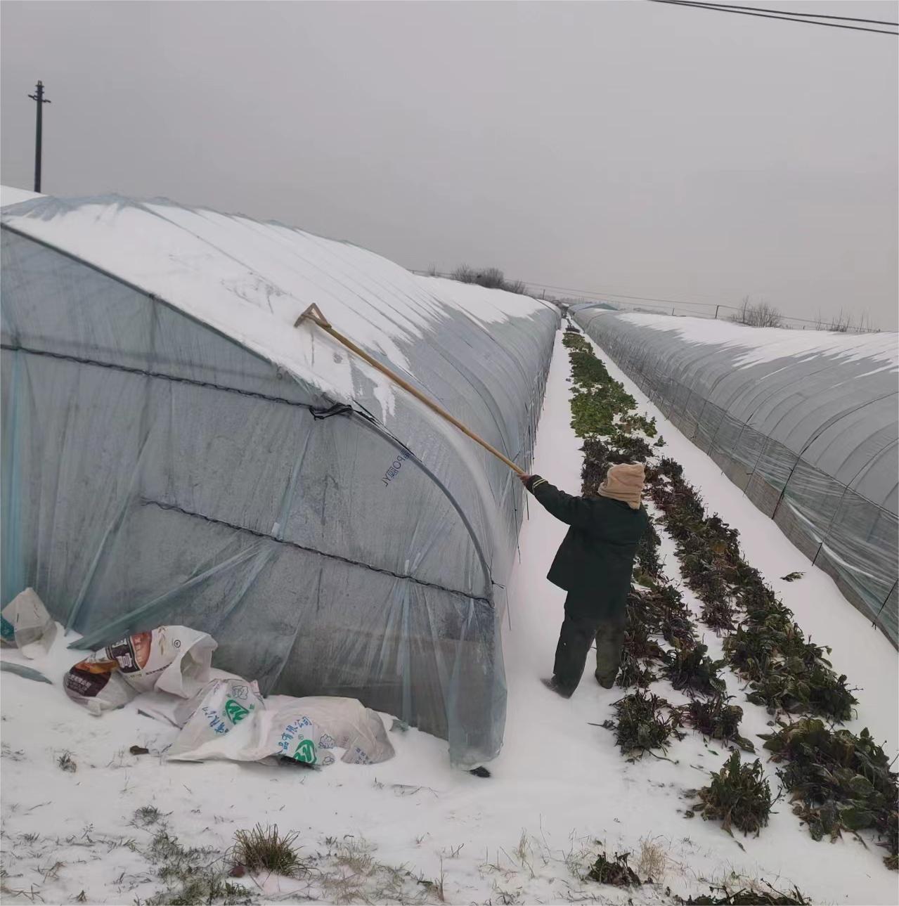 浅蓝色大棚的顶端已被雪覆盖,尹其豹用自制的工具顶起棚子抖雪,并用刮雪板刮雪,用竹竿敲冰。