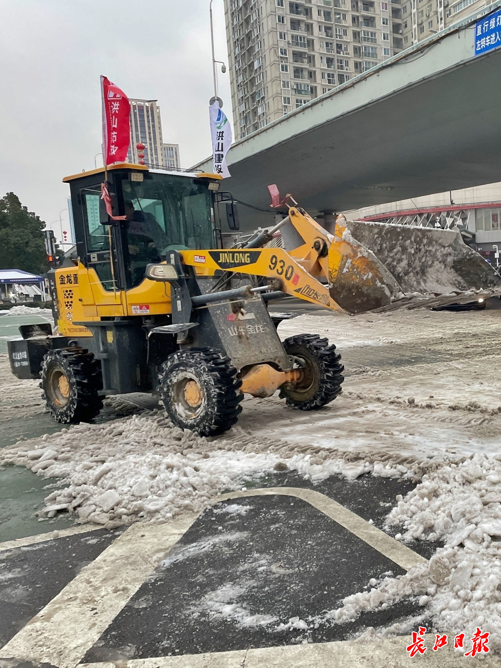 武汉市政负责人介绍,22日凌晨4时,他们派出人手在珞狮路沿线开始铲冰除雪工作,按照“先主路、再支路”原则,利用铁锨、铲雪车等工具,将路面积雪、断枝推扫成堆、统一清运。