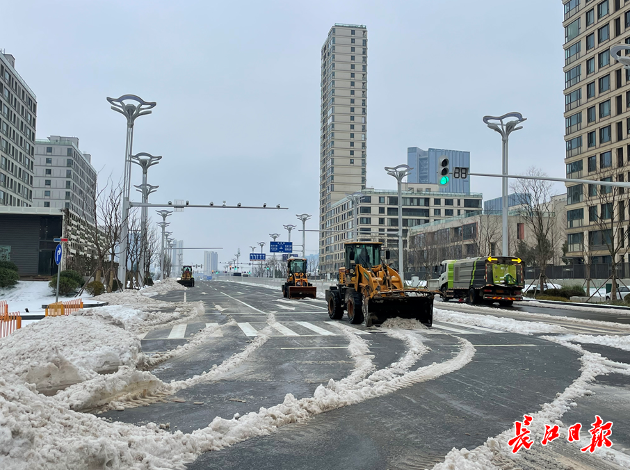 长江日报大武汉客户端2月22日讯 2月21日夜间至22日,武汉出现低温雨雪冰冻天气,天空中冰粒不断。22日上午6时,天色还没亮,路桥公司一分公司经理江漩与同事在高新二路持续扫雪12小时,他拿出随身带的保温杯喝了口热水,随即又投入扫雪工作中,“雪没有停,我们也不能停下,得赶在早高峰前尽量保持路面干净”。