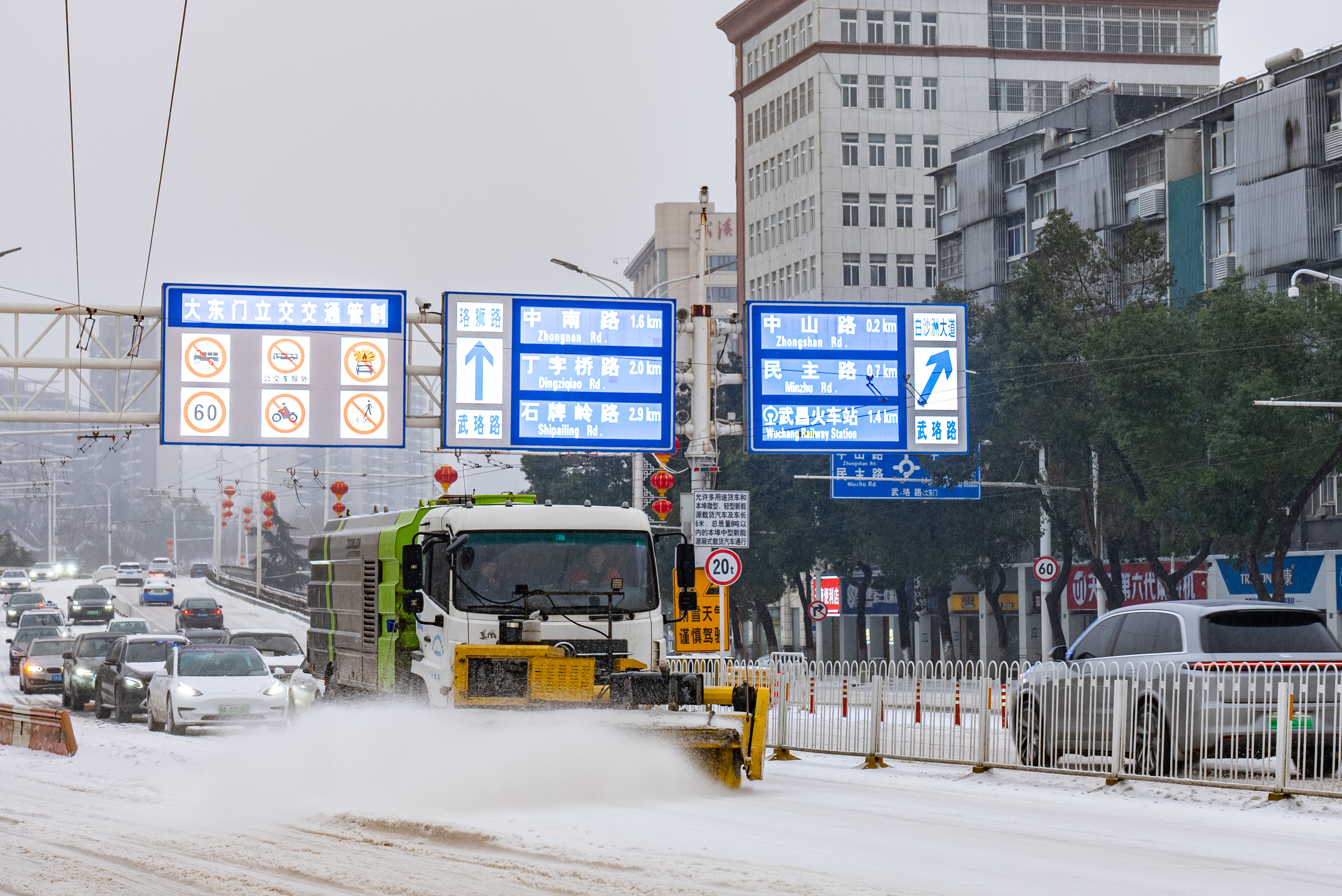 截至22日16时,武昌区出动环卫作业车辆530余台次,环卫作业人员5750余人次,撒融雪剂约580吨,新铺设防滑草垫及麻袋17500个,发现并处理结冰点位44处。武昌区各主次干道持续保持畅通,绿化基本正常,排查处理断枝近百处,暂无倒树发生,发现并处理广告牌安全隐患、景观灯具脱落等问题17处。