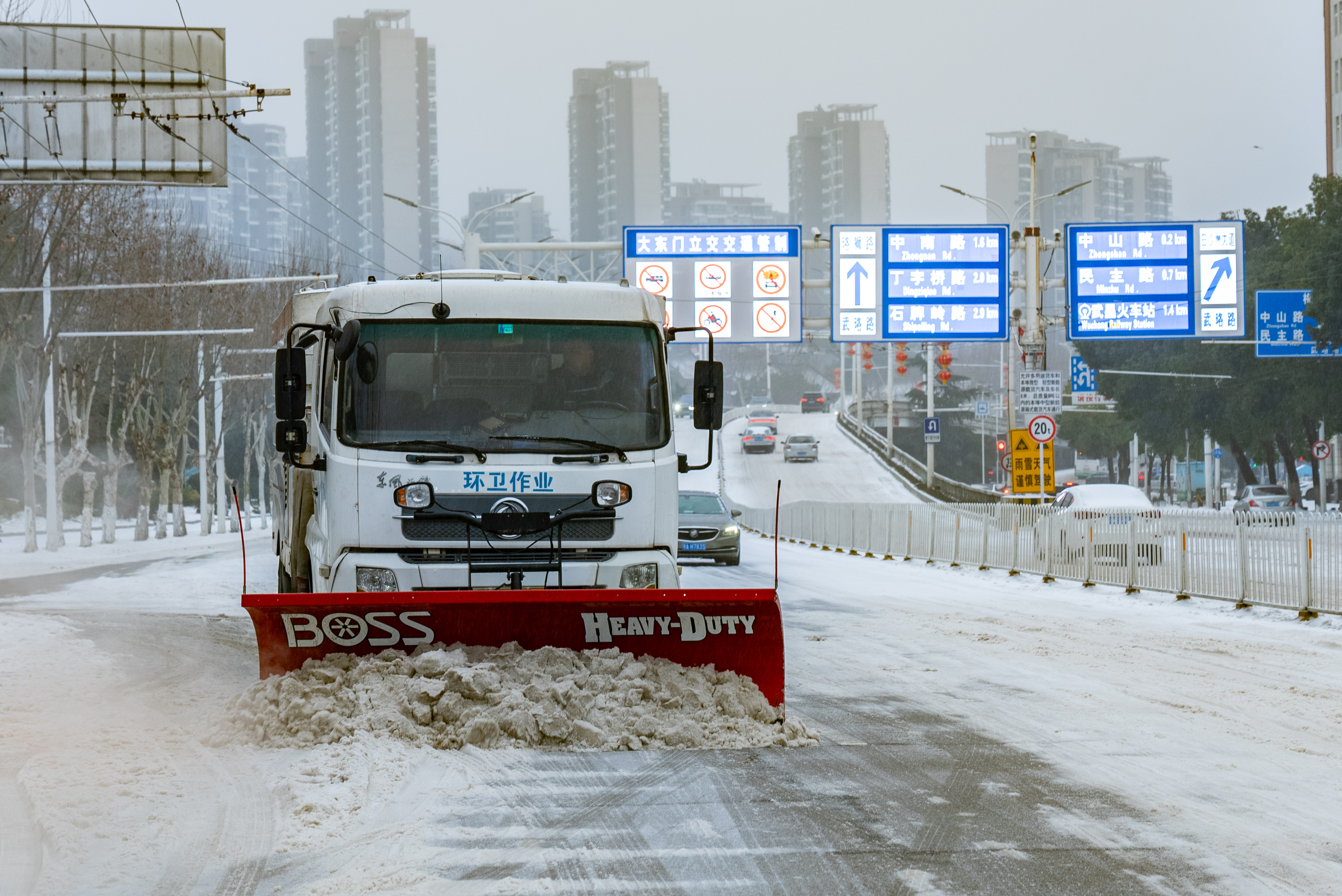 2月22日上午,雪铲车在武珞路沿线机械除雪。 通讯员费帆 白丹 摄