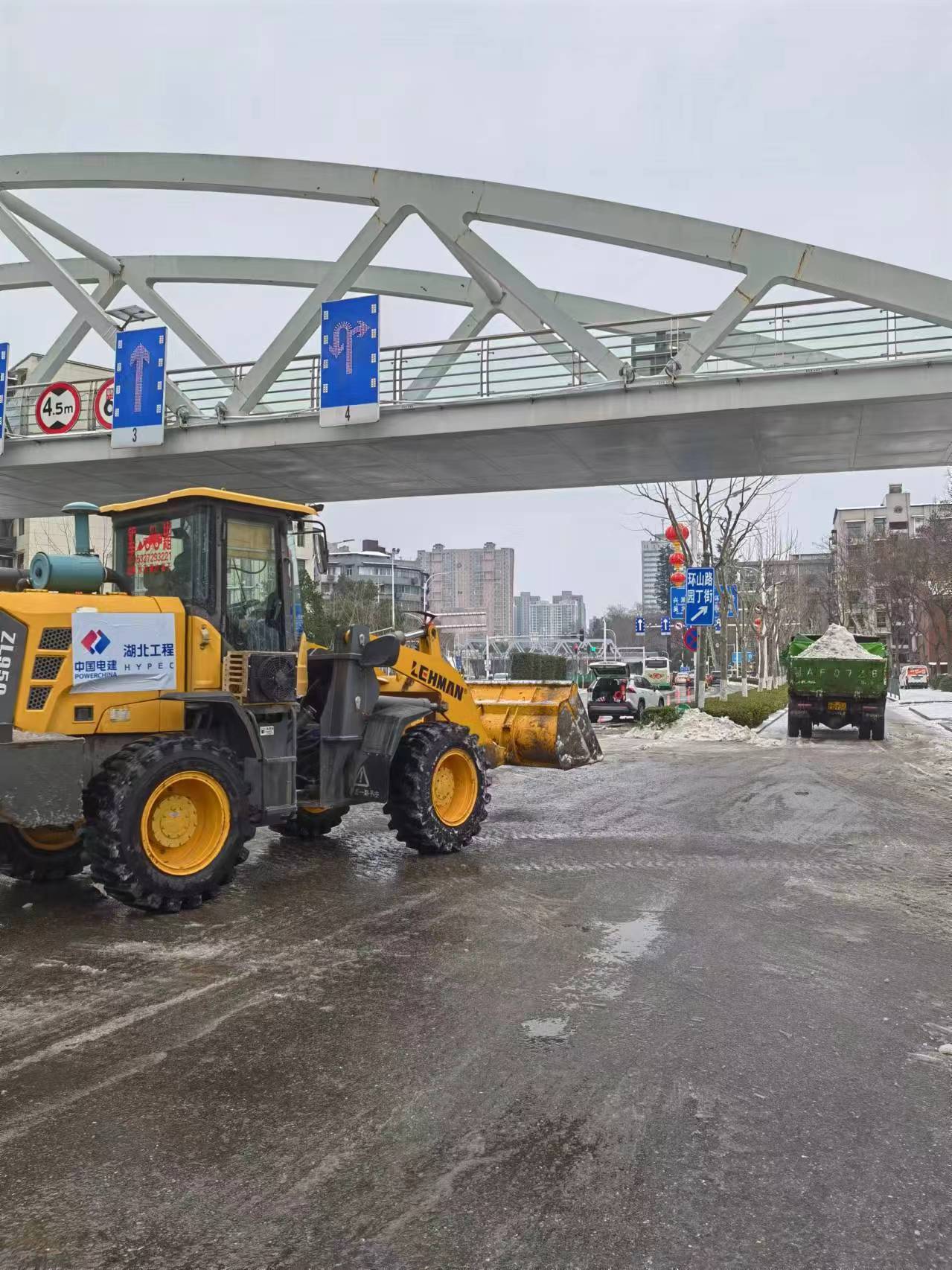 张圆介绍,根据区政府的统一安排,中国电建湖北工程公司主要负责东西湖区五环大道(107国道至三店西路段)、金山大道五环大道交叉口两条匝道、临空港大道北段(国道至三店西路)、五环立交、吴中路人行天桥、环山路人行天桥等区域铲冰除雪任务,公司调配11台设备和10多人的队伍,不间断在道路上除雪。